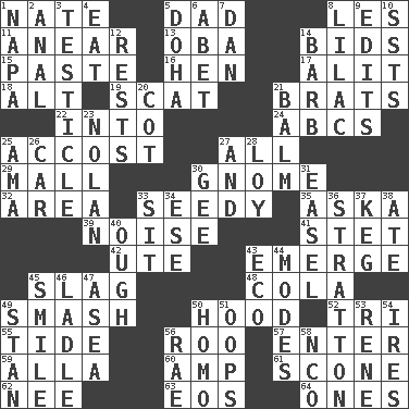 ACROSS 1. Nathan's nickname 5. Male parent 8. French article 11. Approach 13. Chief or king in Benin or Nigeria 14. Auction offers 15. Thick mixture 16. Layer 17. Set down 18. The first octave above the treble staff 19. Scram! 21. Naughty children 22. To the inside or interior of 24. Lettered men learn these first 25. Buttonhole 27. Everything 29. Shopping center 30. Dwarf 32. Type of rug 33. Full of seeds 35. "____ silly question..." 39. Annoying sound 41. Proofreading order 42. Shoshoni 43. Develop 45. Volcanic refuse 48. Root beer relative 49. Box-office sellout 50. Parka part 52. Three (prefix) 55. Periodic rise and fall of the sea level 56. Friend of Pooh 57. Keyboard key 59. Silent film actress Nazimova 60. Electrical Unit 61. Biscuitlike quick bread 62. Born 63. Greek goddess of the dawn 64. Washington bills DOWN 1. California wine valley 2. Of or related to the anus 3. A testis 4. Erode 5. Capital of the state of Qatar 6. Collude with 7. One of the 12 tribes of Israel 8. Pale purple color 9. Prepares for publication 10. Fast planes 12. Musical pauses 14. Sharp remark 20. Small bed 21. Lip ointment 23. Pitcher Ryan 25. Wet nurse (var.) 26. Automobile 27. Added to 28. Myrna of the movies 30. Turn to the right 31. Artist's stand 33. Be seated 34. Compass dir. 36. Ski resort town in Vermont 37. Cask 38. Had dinner 40. Ending for "Through" and "Enough" 43. Environmental prefix 44. Methods 45. Grin 46. Dipping utensil 47. Toward the sea 49. Comedian Laurel of Laurel & Hardy 50. Like (prefix) 51. I made a mistake 53. French philosopher Descartes 54. Angers 56. Actress Charlotte 58. Non-commissioned officer (abbr.)