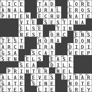ACROSS 1. Louse (plural) 5. Small boy 8. Old wives' tales, e.g. 12. Of or related to the anus 13. Mountain range 15. Greek god of love 16. Eucharist need 18. Shade of tan 19. Nathan's nickname 20. Compete 22. French poetic form 24. Otherwise 26. Metal container 27. A home for chicks 28. The grampus (Milton) 29. Followers of ems 32. Trial 35. Israeli folk dance 37. Spanish title 38. Bowlike part 39. Retirement account (abbr.) 40. "You Light Up My Life" star Conn 41. Girls' org. (abbr.) 42. Get outta here! 43. Shed a tear 44. Elected rep. 45. Raised railways 46. Comfort 49. Ocean 50. Deli pickle 51. Hard copy producer 55. Cartoonist voice _ Blanc 56. Having or resembling wings 57. Nights before holidays 59. Middle Eastern gold or silver currency 63. Yard entry 64. Trig term 65. Short letter 66. Snake ____ (dice throw) 67. Falsehood 68. Jennifer or Joel DOWN 1. Pet locale 2. _ tizzy (2 wds.) 3. Feline 4. Veterans Day date 5. Third day of the wk. 6. Curves 7. Have the gumption 8. Soviet premier 1918-24 9. Northwest Algerian city 10. Roll call or roster of names 11. Compass dir. 14. A period of five years 17. Mediterranean tributary 21. Curvy letter 23. Nervous spasm 25. Value system 28. Declaimed 29. Singer Brickell 30. Connecting point 31. Clip 32. Labels 33. Celtic language 34. Skim 36. Mouth or opening 40. Home 42. Chalkboards 45. Car or cant ending 47. Direct toward a target or goal 48. Downhill vehicle 49. Founders of families 51. Romp 52. Pace 53. Tending to cause great harm 54. Painter Guido (1575-1642) 56. Mature 58. Perceive with the eye 60. And not 61. Had dinner 62. Marina Del _, California