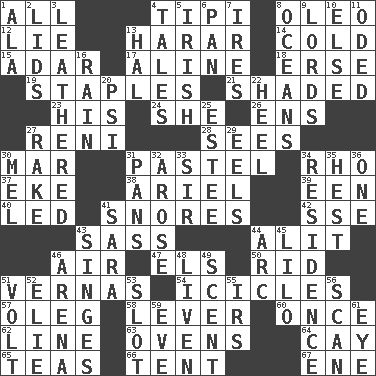 ACROSS 1. 100% 4. Native american tent (variation) 8. Butter sub 12. Whopper 13. Ethiopian city, capital of Harari 14. Chilled 15. The sixth month of the Jewish calendar 17. Place in a line 18. Celtic language 19. Paper fasteners 21. Cast a shadow over 23. Part of HMS, perhaps 24. A female animal or person 26. Followers of ems 27. Painter Guido (1575-1642) 28. Perceives with the eye 30. Impair 31. Soft color 34. 17th letter of the Greek alphabet 37. Supplement with great effort 38. Satellite of Uranus 39. Car or cant ending 40. Directed 41. Sounds asleep 42. Compass dir. 43. Backtalk 44. Came down and settled, as after flight 46. Atmosphere 47. Raised railways 50. To free from 51. Actresses Bloom and Felton 54. Winter's stalactites 57. Cassini of fashion 58. Crowbar 60. At one time in the past 62. Actor's bit 63. Baking chambers 64. Island 65. Beverages made from leaves 66. Portable shelter 67. Compass dir. DOWN 1. Insect wing 2. Hats (slang) 3. Tough but pliablecoriaceous 4. Lies 5. From or relating to Ireland 6. Baking dish 7. Angers 8. Seas 9. Titled peers of a realm 10. Otherwise 11. Wrote a lyric poem 13. Actor Linden 16. Precipitation 20. Air pressure measure (abbr.) 22. Person who is morally reprehensible 25. First name in cosmetics 27. Libertine 29. Snakelike fish 30. Cartoonist voice _ Blanc 31. Zero-star reviews 32. Came up 33. Title for a knight 34. Dwelling 35. Behest 36. Single 41. "Two Mules for Sister ____" 43. Burns superficially 44. Curve 45. _ and Stitch 46. Sports stadium 48. Make or become more lively 49. Aroma 51. Electrical Unit 52. Writer Wiesel 53. Slit 55. Big collection agency 56. Examine minutely or intensely 59. First lady 61. Sight organ