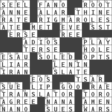 ACROSS 1. Stitch closed the eyes of (a falcon) 5. Papal veil 9. Carrot, for example 13. Queen of England 1702-14 14. Having or resembling wings 15. One or ones belonging to thee 16. Pace 17. Frustrating wastes of time 19. Had dinner 20. Was introduced to 21. First lady 22. Fast jet (abbr.) 23. Celtic language 25. To riddle 26. Goodbye (Sp.) 30. Live dramatic performance 34. Laconic 35. Hollow 36. He sold his birthright 39. Having a sole or soles 42. Elects 43. One who doesn't tell the truth 44. Soviet premier 1918-24 46. SW Asia republic 47. Chalkboard 48. Greek goddess of the dawn 51. Russian ruler of old 54. Take to court 57. Mouth edge 58. Thick or sticky substance 60. Actress Charlotte 62. Interpreter 65. "Corrida" creature 66. Match 67. Nanny 68. So be it 69. Billionth: prefix 70. Institutes legal proceedings 71. Armed conflicts DOWN 1. "Two Mules for Sister ____" 2. Maternal 3. Keyboard key 4. Area sheltered from the wind 5. Conductor's collection 6. Set down 7. Tired old horse 8. Channel Islands abalone 9. 17th letter of the Greek alphabet 10. Lubricates 11. Singles 12. Trial 15. Family _ (genealogy) 18. "___ Maria" 20. Ancient Persian 24. Titan orbits this 27. Big collection agency 28. Bear (Spanish) 29. Exchanges for money 30. Gives a jingle 31. Trim (branches) 32. The first octave above the treble staff 33. Consenting reply 36. Connecticut Ivy Leaguer 37. Title for a knight 38. Auto club (abbr.) 40. Snakelike fish 41. Heredity factor (abbr.) 45. "Tell ____ the Marines!" 48. Otherwise 49. Petroleum 50. Connects, as a bridge 52. Odor 53. Less widely known 54. Comedian Laurel of Laurel & Hardy 55. Capital and largest city of Mongolia 56. Merit 58. Went 59. Mouths or openings 61. Immeasurably long periods of time 63. Modern: prefix 64. The 19th letter of the Greek alphabet 65. The 23rd letter of the Hebrew alphabet