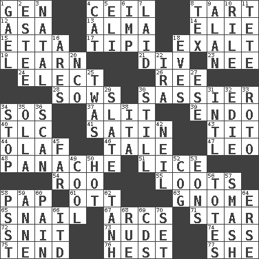 ACROSS 1. Commissioned mil. rank 4. To provide with a ceiling 8. Small pie 12. White ___ sheet 13. _ mater 14. Writer Wiesel 15. Singer James 17. Native american tent (variation) 18. Glorify 19. Memorize 21. HTML Container Element 23. Born 24. Opt 26. To riddle 28. Sty mamas 30. More lively and spirited 34. Distress signal 37. Set down 39. Inside; within (prefix) 40. Affectionate concern, for short 41. Smooth fabric 43. Teat (slang) 44. Norwegian king 46. Falsehood 47. Lion 48. Flamboyance 51. Louse (plural) 54. Friend of Pooh 55. Plunders 58. Infant food 61. Baseball player Mel 63. Dwarf 65. Slow-paced one 67. Arches 71. Play the lead 72. In a ____ (agitated or irritated) 73. Unadorned 74. Double-curved letter 75. Watch over 76. Command 77. A female animal or person DOWN 1. Highlander 2. First name in cosmetics 3. Relating to or accompanying birth 4. Feline 5. Biblical high priest 6. Mischievous child 7. Put down 8. John Ritter's dad 9. ____ Jay Lerner 10. Cause heat under the collar 11. Wig 16. Ancient Greek god of war 18. Nights before holidays 20. Non-commissioned officer (abbr.) 22. Retirement account (abbr.) 25. It was, poetically 27. Compass dir. 29. Schedule 30. Free of sound 31. International (abbr.) 32. Singer Brickell 33. Printing process, for short 34. Constrict 35. Rounded earthenware pot or jar 36. Skim 38. Call ___ day 42. Famous astronaut Armstrong 45. Distant 49. Calm and collected 50. Being at a high temperature 52. Gear tooth 53. Immeasurably long periods of time 56. Lugs 57. Box-office sellout 58. Inconspicuous attention getter 59. Singer Murray 60. Ache 62. Hyperbolic tangent 64. Celtic language 66. It would 68. Sorrow 69. Music discs 70. Put into a specified state