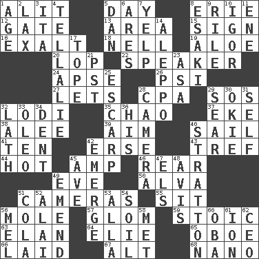 ACROSS 1. Came down and settled, as after flight 5. 24 hours 8. 4th largest of the Great Lakes 12. Yard entry 13. Type of rug 15. Attach a signature 16. Honor 18. 1994 drama film starring Jodie Foster 19. _ vera 20. Trim (branches) 22. Orator 24. Domed church section 26. 23rd letter of the Greek alphabet 27. Allows 28. Tax preparer (abbr.) 29. Distress signal 32. Farming town in central California 35. US Secretary of Labor Elaine L. _ 37. Make supply last 38. Toward shelter 39. Direct toward a target or goal 40. Move on water 41. "___ Little Indians" 42. Celtic language 43. Not kosher 44. Being at a high temperature 45. Electrical Unit 46. Posterior 49. First lady 50. Inventor's middle name 51. Devices for capturing images 55. Be seated 56. Undercover agent 57. Seize upon or latch onto something 59. Unemotional 63. Enthusiasm 64. Writer Wiesel 65. Mitch Miller's instrument 66. Put down 67. Keyboard modifier key 68. Billionth: prefix DOWN 1. Grow older 2. Not strict 3. Call ___ day 4. Copy Pinocchio 5. One of the 12 tribes of Israel 6. Ancient Greek god of war 7. Sharp bark 8. 1973 Nobel Price Winner (Physics) Leo 9. Cause heat under the collar 10. Russian composer Stravinsky 11. Compass dir. 14. City in Syria 17. Drink excessively 21. Pacific Standard Time (abbr.) 23. White ___ sheet 25. Fortification 28. Device for capturing images 29. Scorch 30. Migrant worker of the '30s 31. Oneself 32. Thin strip of wood or metal 33. Butter sub 34. Undesirable depression on a surface 36. Part of HMS, perhaps 40. Ski resort town in Vermont 42. Develop 45. "___ Maria" 47. Raised railways 48. Advice 49. Make improvements or corrections to 51. Root beer relative 52. Mountain range southwest of Kyrgyzstan 53. Silent film actress Nazimova 54. The visible part of the earth's surface 56. Cartoonist voice _ Blanc 58. Was introduced to 60. Chief or king in Benin or Nigeria 61. Electrically charged atom 62. Corporate head (abbr.)