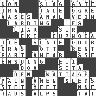 ACROSS 1. Spanish title 4. Volcanic refuse 8. Yard entry 12. Retirement account (abbr.) 13. Story 14. Legendary monster 15. Flower holders 18. Of or related to the anus 19. Distinctive style or manner 20. Preparing or cooking with lard 22. French article 23. One who doesn't tell the truth 24. Title for a knight 25. Make supply last 26. Normal relaxed breathing 30. Standoff 33. Schedule 36. Scent 37. Mouths or openings 39. Baseball player Mel 40. Monthly bill 41. Component 42. Approach 44. Compass dir. 45. Following as a consequence or result 47. Biblical high priest 50. ___ good deed 51. Bristle 53. Lair 54. Electrical Measurement 57. Ache 59. So be it 61. Bobsleighs 63. Proofreading order 64. Confront 65. Compass dir. 66. Small amounts or degrees 67. High mountains 68. Make lace DOWN 1. HTML Container Element 2. Taken by mouth 3. Relating to the nose 4. Comedian Laurel of Laurel & Hardy 5. Austrian-born American filmmaker Fritz 6. In the manner of 7. Set 8. Head of state? 9. Ripens 10. Three (prefix) 11. Car or cant ending 16. One of the Great Lakes 17. Neighbor of Neb. 21. Angers 22. Mouth edge 24. Take to court 26. Singer James 27. Lyric poems 28. Immeasurably long periods of time 29. Johnson of "Laugh-In" 30. Drink excessively 31. SW Asia republic 32. Hearing organs 34. Yearn 35. Had dinner 38. SAT takers 42. Santa ___, CA 43. State of inaction 46. Electrically charged atom 48. Allows 49. Slanted text style (abbr.) 52. Rep 53. Passed on 54. Shed a tear 55. Pismires 56. Pulitzer Prize-winning author Ferber 57. Pacific Standard Time (abbr.) 58. _ moment's notice (2 wds.) 59. Nanny (var.) 60. Cartoonist voice _ Blanc 62. Arrange properly for use