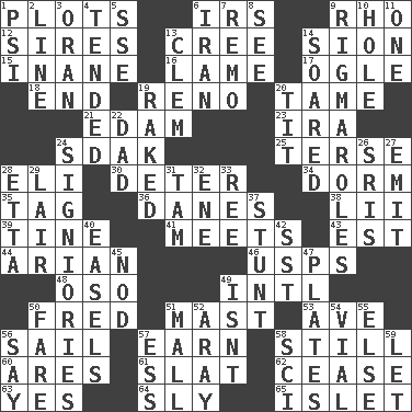 ACROSS 1. Ground plans 6. Big collection agency 9. 17th letter of the Greek alphabet 12. Founders of families 13. Algonquian 14. The Jewish people; Israel 15. Silly 16. Unable to walk 17. Stare at amorously 18. Conclude 19. Western Nevada city 20. Not wild 21. Dutch treat 23. Lyricist Gershwin 24. Neighbor of Neb. 25. Laconic 28. Biblical high priest 30. Prevent from occurring 34. Dormintory (informal) 35. Label 36. Natives or inhabitants of Denmark 38. Cards in a Roman deck? 39. Prong on a fork 41. Confronts 43. Eastern Standard Time (abbr.) 44. Believer in; advocate of (suffix) 46. United States Postal Service (abbr.) 48. Bear (Spanish) 49. International (abbr.) 50. Flintstone 51. Vertical spar for supporting sails 53. "___ Maria" 56. Move on water 57. Merit 58. Not moving 60. Ancient Greek god of war 61. Narrow board 62. Stop 63. Consenting reply 64. Playfully artful 65. Small island DOWN 1. Air pressure measure (abbr.) 2. Actor's bit 3. Northwest Algerian city 4. Looked after 5. Compass dir. 6. SW Asia republic 7. San ____ (Riviera town) 8. Observe 9. Complicated, petty procedures 10. Opening into or through something 11. Single 13. Clement's nick name 14. Flew 19. Swept the length of 20. Teat (slang) 22. Male parent 24. Seigniories (variant) 26. Indian titles of respect 27. Send forth 28. Singer James 29. Den 31. Scottish cap 32. Compass dir. 33. Portuguese money of account (variant) 37. Check the growth or development of 40. Artist's stands 42. Fast jet (abbr.) 45. Lower and raise head in agreement 47. Food holders 49. Is not 50. Conductor's collection 51. Shopping center 52. Like ___ of sunshine 54. Small bottle 55. Otherwise 56. Declare 57. Double-curved letter 58. _-fi 59. Allow