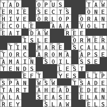ACROSS 1. Small boy 4. Musical composition 8. The 23rd letter of the Hebrew alphabet 11. One of the Great Lakes 13. Religious groups 15. Single 16. Hub of activity 17. Lowest deck of a ship 18. Northwest Algerian city 19. Learning spot: Fr. 21. Auto club (abbr.) 22. Electrical Unit 23. Consume 24. Obsolete 27. To sift 29. Capri or Wight 30. Channel Islands abalone 34. Shallow baking pan 36. Female horse 39. Any of the three canals of the cochlea 40. Torque (variant) 41. Scent 43. Domed church section 44. With great haste 46. Earth 47. Compass dir. 48. Looks after 49. For fear that 51. Lizard (obsolete) 53. Consenting reply 54. Mouth edge 57. Connect, as a bridge 60. Compass dir. 63. Sadhe (variant) 65. Small pie 66. At or in the front 69. Genesis locale 70. Chicken ___ king 71. Gospel singer Marvin 72. Flair 73. Marina Del _, California 74. Cole _ (cabbage dish) 75. Raised railways DOWN 1. Giggle 2. N. Chile seaport 3. A piece of turf (Scot.) 4. Bear (Spanish) 5. For each 6. Southern CA. univ. 7. Portico 8. "Corrida" creature 9. Of or related to the anus 10. Gone 12. Snakelike fish 14. Practice fight 18. Cloudy 20. Begley and Asner 25. _ mater 26. Puts on (as clothing) 28. Greek goddess of the dawn 29. Event 31. Atlas contents 32. Otherwise 33. Actress Charlotte 34. Heavy book 35. SW Asia republic 37. Friend of Pooh 38. Poet Dickinson 40. Make lace 42. Toward shelter 45. Overdraft (abbr.) 50. Fast jet (abbr.) 52. It was, poetically 54. Dipping utensil 55. Standard of perfection 56. Actor Sean's family 57. Play the lead 58. Light colored 59. Like ___ of sunshine 61. "______ My Girl" (Turtles hit) 62. Welt 64. Observe 67. White ___ sheet 68. Morning condensation