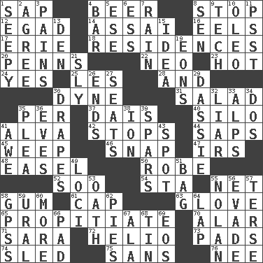 ACROSS 1. Plant excrement 4. Fermented drink made from hops 8. Discontinue 12. Mild oath 14. Slender Brazilian palm 16. Snakelike fish 17. 4th largest of the Great Lakes 18. Dwellings 20. Actor Sean's family 22. Modern: prefix 23. Being at a high temperature 24. Consenting reply 25. French article 28. Also 30. Unit of force 31. Vegetable dish 35. For each 37. Raised platform 40. Grain storage tower 41. Inventor's middle name 42. Obstructs or blocks passage 44. Plant excrements 45. Shed a tear 46. Fastener 47. Big collection agency 48. Artist's stand 50. Loose flowing garment 52. "Barney Miller" actor Jack 54. R.R. building 55. Fish or hair follower 58. Chewing product 61. Head covering 63. Michael Jackson trademark 65. Conciliate 70. Having or resembling wings 71. "Two Mules for Sister ____" 72. Sun: prefix 73. Writing tablets 74. Downhill vehicle 75. Without 76. Born DOWN 1. Not well drained, as in land 2. Match 3. Aches 4. Long, evenly shaped piece 5. Compass dir. 6. Curvy letter 7. Precipitation 8. Elected rep. 9. Technical 10. Butter sub 11. Inconspicuous attention getter 13. Lair 15. The main thing one is thinking about 19. Immeasurably long periods of time 21. Wily 26. Conclusions 27. Theater features 29. Hyrax 30. Window treatments 32. One who doesn't tell the truth 33. High mountains 34. Two (Sp.) 35. Entreaty 36. Nights before holidays 38. Electrically charged atom 39. Practice fights 41. Deep reverence 43. Specific locale 49. Venues 51. Container for groceries 53. Pledge 55. Pitcher Ryan 56. Elude 57. Laconic 58. Global Positioning Systems (abbr.) 59. Mountain range 60. Greater amount 62. Sliced desserts 64. Pet locale 66. Groovy apt. 67. Wing 68. Shallow baking pan 69. Greek goddess of the dawn