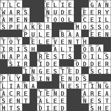 ACROSS 1. Affectionate concern, for short 4. Writer Wiesel 8. Separate the seeds from cotton 11. Armed conflicts 13. Unadorned 14. Suggestive of the supernatural 15. So be it 16. Utensil 17. To provide with a ceiling 18. Orator 21. With motion or animation 22. Whine 23. Sound made by sheep 25. Car or cant ending 26. Small child 29. Veterans Day date 32. From or relating to Ireland 34. Keyboard modifier key 35. Chief or king in Benin or Nigeria 38. California wine valley 39. Musical pauses 41. Lubricates 43. Title for a knight 44. Binary compound 45. More peculiar 46. Consumed 50. _-fi 51. Travel a route regularly 54. Storage container 55. Conclusions 57. Climbing, woody, usually tropical vines 59. Nestling 63. 1/640 square mile 64. Be inclined (to) 67. Length times width 68. Emitted 69. Toward shelter 70. Egg locale 71. Mountains (abbr.) 72. Passed on 73. A female animal or person DOWN 1. It was, poetically 2. Desk light 3. Algonquian 4. Main course 5. Nilotic language 6. Wedding promise 7. Snakelike fish 8. Honkers 9. Get up 10. High-strength synthetic material 12. Fastener 14. Environmental prefix 19. Malaysian steamed pastry 20. Pipe bend 21. Floor protector 23. Waist strap 24. Pismires 26. Shallow baking pan 27. Mouths or openings 28. Native american tent (variation) 30. Flower holders 31. Parka part 33. Indian skirt 36. Auction offers 37. Actor Baldwin 39. Swiss mountan, "Queen of the Mountains" 40. Locale of original sin 42. _ Lanka 45. Probability 47. Basketball assoc. 48. Watched over 49. Compass dir. 51. Suffix with ecto or cyto 52. It is permitted: Lat. 53. Tall tales 56. Comedian Laurel of Laurel & Hardy 58. Remaining after all deductions 60. Angers 61. Delicate 62. Yard entry 64. Small amount or degree 65. Connecticut Ivy Leaguer 66. Born