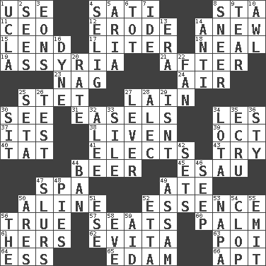 ACROSS 1. Purpose 4. Suttee (variant) 8. R.R. building 11. Corporate head (abbr.) 12. Eat (away) 14. Afresh 15. Grant temporary use of 17. 61 cubic inches 18. Anneal 19. Nineveh was its capital 21. Following 23. Tired old horse 24. Atmosphere 25. Proofreading order 27. (Had) reclined 30. Perceive with the eye 31. Artist's stands 34. French article 37. It is 38. Make or become more lively 39. Sep. follower 40. Make lace 41. Chooses 43. Attempt to accomplish something 44. Fermented drink made from hops 45. He sold his birthright 47. Health resort 49. Had dinner 50. Place in a line 52. Center 56. Loyal 57. Theater features 60. Inside of hand 61. Possessive pronoun 62. Webber/Rice musical 63. Luau course 64. Double-curved letter 65. Dutch treat 66. Fitting DOWN 1. Southern CA. univ. 2. Perceives with the eye 3. Immeasurably long periods of time 4. Former Milwaukee Brewers owner Bud 5. Operatic vocal solo 6. Small child 7. Binary compound 8. Scornful expression 9. Pull into pieces 10. Leather borer 13. Epoch 14. Opposed to 16. Unit of force 20. Pace 22. Avid follower 25. Stalk of a moss capsule 26. Trial 27. Prying instrument 28. Actor Baldwin 29. Is not 30. Be seated 32. Toward shelter 33. Filth; sediment 34. Globular water bottle used in Asia 35. Shade of tan 36. Filthy place 42. Puts into a specified state 44. Forbid 46. Ooze 47. Runs notes together 48. Sliced desserts 49. Indian state 50. Ancient Greek god of war 51. Compass dir. 52. Singer James 53. California wine valley 54. Hoof sound 55. Give off 56. Definite Article 58. First lady 59. Help