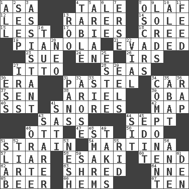 ACROSS 1. White ___ sheet 4. Falsehood 8. Norwegian king 12. French article 13. More uncommon 14. Flatfish 15. For fear that 17. Off-Broadway awards 18. Algonquian 19. Player piano 21. Eluded 23. Take to court 24. Compass dir. 26. Big collection agency 27. "Tell ____ the Marines!" 28. Oceans 30. Period 31. Soft color 34. 4-wheeled motor vehicle 37. Elected rep. 38. Satellite of Uranus 39. Chief or king in Benin or Nigeria 40. Fast jet (abbr.) 41. Sounds asleep 42. Atlas unit 43. Backtalk 44. Back-to-school mo. 46. Baseball player Mel 47. Eastern Standard Time (abbr.) 50. Wedding promise 51. Put through a sieve 54. Chrissie's court nemesis 57. One who doesn't tell the truth 58. 1973 Nobel Price Winner (Physics) Leo 60. Be inclined (to) 62. Johnson of "Laugh-In" 63. Tear up 64. Compass dir. 65. Fermented drink made from hops 66. Cloth borders 67. Nine, plus one DOWN 1. Everything 2. Ooze 3. Helper 4. Eating place 5. Believer in; advocate of (suffix) 6. Area sheltered from the wind 7. Celtic language 8. Motion picture awards 9. Titled peers of a realm 10. Toward shelter 11. Nourish 13. Friend of Pooh 16. Drawn tight 20. Modern: prefix 22. Small bottle 25. First name in cosmetics 27. Angers 29. Snakelike fish 30. Double-curved letter 31. Baking dishes 32. Came up 33. Title for a knight 34. Piece 35. Blind as ____ 36. Strike 41. Suttee (variant) 43. A viewer who gazes fixedly 44. Be seated 45. Prepare for publication 46. Speak pompously 48. Excessive but superficial compliments 49. Receives possession of 51. Broad, flat, thick piece 52. Hoop that covers a wheel 53. Tender 55. To free from 56. Singer Murray 59. A female animal or person 61. Lair