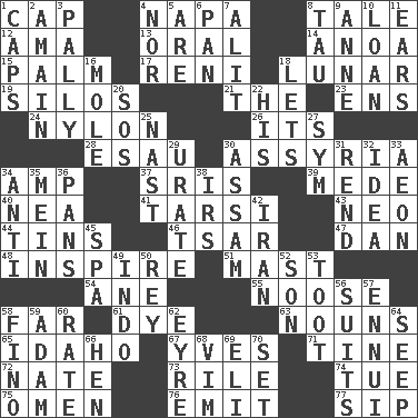 ACROSS 1. Head covering 4. California wine valley 8. Story 12. Nursemaid (var.) 13. Relating to the mouth 14. Small Philippine buffalo 15. Inside of hand 17. Painter Guido (1575-1642) 18. Type of eclipse 19. Grain storage towers 21. Definite Article 23. Followers of ems 24. High-strength synthetic material 26. ___ a Wonderful Life 28. He sold his birthright 30. Nineveh was its capital 34. Electrical Unit 37. Indian titles of respect 39. Ancient Persian 40. Teachers' org. 41. Tarsus (plural) 43. Modern: prefix 44. Airtight sealed metal containers 46. Russian ruler of old 47. One of the 12 tribes of Israel 48. Motivate 51. Vertical spar for supporting sails 54. One (Scot) 55. Trap for birds or small mammals 58. Distant 61. Color 63. Parts of speech 65. Potato state 67. Jacques Cousteau's middle name 71. Prong on a fork 72. Nathan's nickname 73. Cause heat under the collar 74. Third day of the wk. 75. Sign of something about to happen 76. Send forth 77. Small drink DOWN 1. Balmoral and tarboosh 2. At full speed 3. Friendly 4. And not 5. "We ___ not amused" (Victoria) 6. Baking dish 7. Came down and settled, as after flight 8. The 19th letter of the Greek alphabet 9. Queen of England 1702-14 10. Grant temporary use of 11. Hearing organs 16. Undercover agent 18. Allows 20. Mayday 22. Part of HMS, perhaps 25. Political cartoonist Thomas 27. Symbol (abbr.) 29. A salt of uric acid 30. Indian state 31. Tear apart 32. The content of cognition 33. A really long time 34. Opposed to 35. Chow _ 36. Zero-star reviews 38. Big collection agency 42. SW Asia republic 45. Health resort 49. _ china 50. Marina Del _, California 52. Male offspring 53. A blast of a horn 56. Sets of matching outer garments 57. World-weariness 58. A pale, very dry sherry 59. First man 60. Pace 62. Jane of fiction 64. Ooze 66. Layer 68. Zeal 69. Biblical high priest 70. Put into a specified state