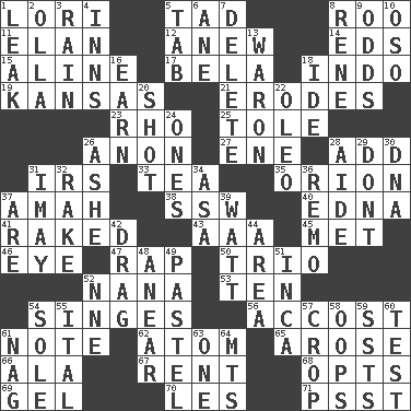 ACROSS 1. Australian parrot (variant) 5. Bit 8. Friend of Pooh 11. Enthusiasm 12. Afresh 14. Begley and Asner 15. Place in a line 17. Actor Lugosi 18. _ china 19. Sunflower state 21. Eats (away) 23. 17th letter of the Greek alphabet 25. Lacquered or enameled metalware 26. At once, immediately (arch.) 27. Compass dir. 28. Find the sum of 31. Big collection agency 33. Beverage made from leaves 35. Constellation of myth 37. Housemaid 38. Compass dir. 40. Pulitzer Prize-winning author Ferber 41. Moved through 43. American Automobile Association (abbr.) 45. Was introduced to 46. Sight organ 47. Hit sharply and swiftly 50. Musical group of three 52. Grandmother 53. "___ Little Indians" 54. Scorches 56. Buttonhole 61. Make mention of 62. Tiny particle 65. Came up 66. In the manner of 67. Monthly bill 68. Chooses 69. Set 70. French article 71. Inconspicuous attention getter DOWN 1. Path through which fluid escapes 2. Water jar 3. Precipitation 4. Lodging establishments 5. Bar bill 6. One (Scot) 7. Erase 8. French philosopher Descartes 9. Probability 10. Bear (Spanish) 13. Make _____ (do battle with) 16. Merit 18. Binary compound 20. Guess 22. Margarine 24. Washington bills 26. American tennis player Robert 28. Helper 29. Do not 30. Heredity factor (abbr.) 31. "If ____ say so..." 32. Immoral or dissolute person 34. White ___ sheet 36. San ____ (Riviera town) 37. "We ___ not amused" (Victoria) 39. Electrical Unit 42. To draw with force 44. Length times width 48. Approach 49. Soft color 51. South American Indian 52. Compass dir. 54. Flatfish 55. Slanted text style (abbr.) 57. Riding implement 58. I made a mistake 59. Fast planes 60. Trial 61. Tired old horse 63. Single 64. Mountains (abbr.)
