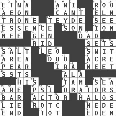 ACROSS 1. Inactive volcano in Sicily 5. Cuckoo 8. Friend of Pooh 11. A really long time 12. Patter 14. Shade tree 15. Heavy duty weighing machine 17. Miss Universe 1986, Barbara Palacios _ 18. Observe 19. Substance 21. Male child 22. Electrically charged atom 23. Born 24. Commissioned mil. rank 25. Male parent 27. To free from 28. Puts into a specified state 31. Table seasoning 35. Lion 37. In a ____ (agitated or irritated) 38. Length times width 39. Superhero pair 41. 43,560 square feet 42. Lightbulb-shaped fruit 43. Retirement account (abbr.) 45. Confront 46. Fast planes 47. According to 49. Part of HMS, perhaps 51. Scottish cap 52. Ocean 55. "We ___ not amused" (Victoria) 57. 23rd letter of the Greek alphabet 60. Speakers 62. Oblong piece of solid material 63. Thespian 65. Saint headwear 66. Falsehood 67. College mil. group 68. Ancient Persian 69. Conclusion 70. Small child 71. Locale of original sin DOWN 1. Consumed 2. Laconic 3. Trap for birds or small mammals 4. Queen of England 1702-14 5. Adept person 6. Negative votes 7. Southeast Asian peninsula 8. Home 9. Butter sub 10. Sign of things to come 13. Be inclined (to) 16. Engineer (abbr.) 17. Looked after 20. To provide with a ceiling 26. Indian state 29. Hoop that covers a wheel 30. Proofreading order 31. Plant excrements 32. Ancient Greek god of war 33. Resembling or made to resemble leather 34. Tarsus (plural) 36. Fr. "Yes" 40. Speaker 44. Having or resembling wings 48. Wet nurse 50. Practice fight 52. Having a sole or soles 53. Eat (away) 54. NE Netherlands city 55. Competent 56. Water falling in drops from the sky 58. Highlander 59. "Tell ____ the Marines!" 61. Not wild 64. Sep. follower