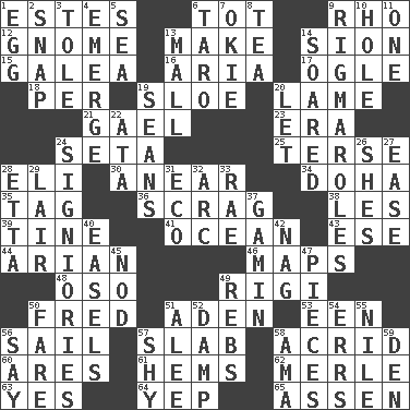 ACROSS 1. _____ Park, CO 6. Small child 9. 17th letter of the Greek alphabet 12. Dwarf 13. Cause to be 14. The Jewish people; Israel 15. An organ shaped like a helmet 16. Operatic vocal solo 17. Stare 18. For each 19. A type of plum 20. Unable to walk 21. Highlander 23. Period 24. Stalk of a moss capsule 25. Laconic 28. Biblical high priest 30. Approach 34. Capital of the state of Qatar 35. Label 36. Lean end of the neck 38. French article 39. Prong on a fork 41. Sea 43. Compass dir. 44. Believer in; advocate of (suffix) 46. Atlas contents 48. Bear (Spanish) 49. Swiss mountan, "Queen of the Mountains" 50. Flintstone 51. An important port of Yemen 53. Car or cant ending 56. Travel by water 57. Thick slice 58. Sour-tasting 60. Ancient Greek god of war 61. Is hesitant and indecisive 62. Haggard of country music 63. Consenting reply 64. Slangy assent 65. NE Netherlands city DOWN 1. Ovum 2. Fastener 3. Lacquered or enameled metalware 4. Develop 5. Ocean 6. Pacific island yam 7. Migrant worker of the '30s 8. Afternoon social gathering 9. Complicated, petty procedures 10. Hollow 11. Single 13. Shopping center 14. Flew 19. Actors Connery and Penn 20. Allow 22. _ moment's notice (2 wds.) 24. Seigniories (variant) 26. "______ My Girl" (Turtles hit) 27. Relaxation 28. Singer James 29. Den 31. Environmental prefix 32. Curve 33. Actress Charlotte 37. Street urchin 40. Artist's stands 42. Tired old horse 45. Dreamland 47. Parts 49. Confederate soldiers (slang) 50. Conductor's collection 51. Toward shelter 52. Moist 54. Blunders 55. "Death on the ____" 56. Declare 57. Like a shrinking violet 58. Wet nurse (var.) 59. Lair