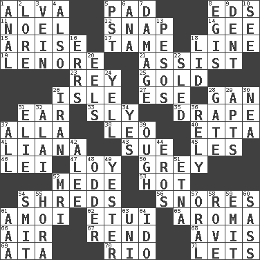 ACROSS 1. Inventor's middle name 5. Groovy apt. 8. Begley and Asner 11. Christmas carol 12. Fastener 14. Unit of force equal to gravity 15. Ascend 17. Docile 18. Actor's bit 19. Poe poem 21. Help 23. Marina Del _, California 25. Aureate 26. Small island 27. Compass dir. 28. Separate the seeds from cotton 31. Hearing organ 33. Secret 35. Window treatment 37. Silent film actress Nazimova 38. Lion 40. Singer James 41. Climbing, woody, usually tropical vines 43. Take to court 45. French article 46. Luau accessory 47. Myrna of the movies 50. Jennifer or Joel 52. Ancient Persian 53. Being at a high temperature 54. Tears up 56. Sounds asleep 61. Mine, in Marseilles 62. Needle case 65. Odor 66. Atmosphere 67. Tear apart 68. Advice 69. "One Day ___ Time" 70. _ de Janeiro 71. Allows DOWN 1. Of or related to the anus 2. Old wives' tales, e.g. 3. Distinctive style or manner 4. In addition 5. Pacific Standard Time (abbr.) 6. Santa ___, CA 7. Break 8. The front part of a cuirass 9. Gouge 10. Observe 13. Mexican monetary units 16. Blunders 18. Hat (slang) 20. Snakelike fish 22. Downhill vehicle 24. Shout 26. SW Asia republic 28. Yard entry 29. Flats, for short 30. Teachers' org. 31. Writer Wiesel 32. Jai ____ 34. It is so 36. Trust 37. 100% 39. Ending for "Through" and "Enough" 42. Toward shelter 44. Greek god of love 48. More peculiar 49. Last past 51. Inactive volcano in Sicily 52. Medical imaging device (abbr.) 54. Stricken, poetically 55. Israeli folk dance 57. Spoken 58. Be footloose 59. Send forth 60. Backtalk 61. American Automobile Association (abbr.) 63. Corn or form start 64. Wedding promise
