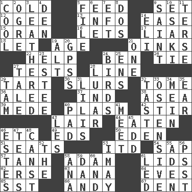ACROSS 1. Chilled 5. Nourish 9. Put into a specified state 12. Double curve, resembling the letter S 13. Information 14. Comfort 15. Northwest Algerian city 16. Allows 17. One who doesn't tell the truth 18. Allow 19. Mature 21. Pig sounds 22. Aid 24. Benjamin's nick name 26. Neckwear 27. Trials 28. Actor's bit 29. Small pie 30. Disparaging remarks 32. Heavy book 36. Toward shelter 37. Working for oneself (abbr.) 38. At sea 39. Ancient Persian 40. Suffix with ecto or cyto 42. Agitate 43. Den 44. Eroded 46. And so on (abbr.) 49. Begley and Asner 50. Paradise 51. Theater features 53. It would 54. Plant excrement 57. Hyperbolic tangent 58. First of billions? 61. Hats (slang) 62. Celtic language 63. Nanny 64. Nights before holidays 65. Fast jet (abbr.) 66. Actor Griffith 67. Undesirable depression on a surface DOWN 1. Calm and collected 2. Legendary monster 3. Resembling or made to resemble leather 4. Lair 5. Do some clerical work 6. Compass dir. 7. Lizard (obsolete) 8. Two (Sp.) 9. Inhabitant of Heaven 10. 1973 Nobel Price Winner (Physics) Leo 11. Laconic 14. Connecticut Ivy Leaguer 19. Keyboard modifier key 20. Global Positioning Systems (abbr.) 21. Single 23. First name in cosmetics 24. Avian creatures 25. Followers of ems 27. Lie 28. Type of eclipse 29. Scottish cap 31. Ms. Damita and namesakes 32. Clothes sense 33. Clearly or manifestly demonstrative 34. Count _ (2 wds.) 35. Hearing organ 40. Groovy apt. 41. Rendezvous 43. French article 45. Say or write further 46. _____ Park, CO 47. Pulls apart 48. 2nd pers. sing. pres. of can (arch.) 52. Definite Article 53. "If ____ say so..." 55. An important port of Yemen 56. Inconspicuous attention getter 58. Santa ___, CA 59. One of the 12 tribes of Israel 60. Added to 61. Directed