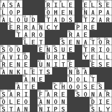 ACROSS 1. White ___ sheet 4. Cause heat under the collar 8. Otherwise 12. Trim (branches) 13. Sign of things to come 14. California wine valley 15. Verbally 18. Small amounts or degrees 19. Czar 20. The state or an instance of erring 22. Before (prefix) 23. Pacific island yam 24. Actress Charlotte 25. Allow 26. Legislator 30. "Barney Miller" actor Jack 33. Follow as a consequence or result 36. Musical group of three 37. Enthusiastic 39. RI univ. 40. Shout 41. French philosopher Descartes 42. Join together 44. Compass dir. 45. Short socks 47. Basketball assoc. 50. A saturated hydrocarbon 51. Dunce 53. Had dinner 54. Elects 57. Indian skirt 59. Conductor's collection 61. Underwater navigation system 63. Margarine 64. Soon (poet.) 65. Pass on 66. Comedian Laurel of Laurel & Hardy 67. Pinches, bites 68. Cunning DOWN 1. Insect wing 2. Flatfish 3. To the left, to Queeg 4. College mil. group 5. "If ____ say so..." 6. Directed 7. Followers of ems 8. Plea 9. Goldbrick 10. Health resort 11. Ewer handle 16. Mountain range 17. Have the gumption 21. Observe 22. Baking dish 24. To sift 26. Costume for a special activity 27. Woody plant 28. Petroleums 29. Hero or heavy, e.g. 30. "Two Mules for Sister ____" 31. Baking chamber 32. Pig sound 34. Religious women 35. Indian title of respect (Mr.) 38. Accusation by an informer 42. Shoshoni 43. Inside; within (prefix) 46. Compass dir. 48. Expressions of contempt or scorn 49. In addition 52. Watches over 53. Length times width 54. Riding implement 55. Coop moms 56. Travel by water 57. Mayday 58. The first octave above the treble staff 59. Air blower 60. Black tropical American cuckoo 62. Marina Del _, California