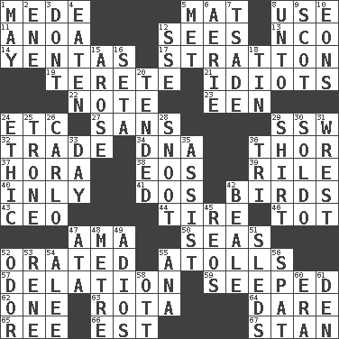 ACROSS 1. Ancient Persian 5. Floor covering 8. Purpose 11. Small Philippine buffalo 12. Observes 13. Non-commissioned officer (abbr.) 14. Gossips 17. Ski resort town in Vermont 19. Cylindrical with tapered ends 21. Foolish or stupid persons 22. Make mention of 23. Car or cant ending 24. And so on (abbr.) 27. Without 29. Compass dir. 32. Buy and sell 34. Heredity factor (abbr.) 36. Son of Odin 37. Israeli folk dance 38. Greek goddess of the dawn 39. Cause heat under the collar 40. In an inward manner 41. Two (Sp.) 42. Avian creatures 43. Corporate head (abbr.) 44. Become fatigued 46. Small child 47. Nanny (var.) 50. Oceans 52. Spoke pompously 55. Ringlike coral islands and reefs 57. Conveyance 59. Oozed 62. Single 63. Round or rotation of duties 64. Have the gumption 65. To separate or throw off 66. Eastern Standard Time (abbr.) 67. Comedian Laurel of Laurel & Hardy DOWN 1. Can I? 2. Compass dir. 3. Do not 4. Eroded 5. Was introduced to 6. Nest on high 7. Sadhe (variant) 8. To (old English) 9. Native of Scotland 10. Immeasurably long periods of time 12. Compass dir. 15. Came up 16. Stalk of a moss capsule 18. Shallow baking pan 20. Looked after 24. Principle of right and wrong 25. Heavy duty weighing machine 26. Monte _, Las Vegas Hotel/Casino 28. Snout, nose 29. Upper-body garment 30. Twentieth part of a lira 31. Obtain by seizing forcibly or violently 33. 24 hours 35. Help 36. Three (prefix) 42. Memphis, Tenn. Street 45. Vintage cars 47. "One Day ___ Time" 48. Distance measurement (Brit.) 49. Goodbye (Sp.) 51. Bobsleighs 52. Scent 53. French philosopher Descartes 54. Toward shelter 55. Santa ___, CA 56. Argument over a trivial matter 58. Baseball player Mel 60. Epoch 61. Lair