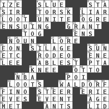 ACROSS 1. Ending with capital 4. Change direction abruptly 8. R.R. building 11. Title for a knight 12. Cod relative 14. One who doesn't tell the truth 15. Plunder 17. Join together 18. Legendary monster 19. Following as a consequence or result 21. Monetary aid 23. Coat; cloak 24. Followers of ems 25. Part of speech 27. Old wives' tales, e.g. 30. Period of immesurable duration 31. Fodder prepared in a silo 34. Player for Phoenix 37. And so on (abbr.) 38. Cowboy competition 39. Compass dir. 40. Area sheltered from the wind 41. Most capable 43. Parent Teacher Assoc. 44. Leg joint 45. "Beetle Bailey" pooch 47. Basketball assoc. 49. Luau course 50. Plunders 52. Apple salad 56. Fine (Spanish) 57. Guide 60. 4th largest of the Great Lakes 61. Nights before holidays 62. Incident 63. Grow older 64. Was introduced to 65. Pismires 66. Hat (slang) DOWN 1. Capri or Wight 2. The Jewish people; Israel 3. Greek god of love 4. Feeling sharp psychological pain 5. Yearn 6. RI univ. 7. Eastern Standard Time (abbr.) 8. Omens 9. Small pie 10. "We ___ not amused" (Victoria) 13. Barrel 14. Grant temporary use of 16. Ballerina skirt 20. Charged particles 22. To sift 25. Brief written record 26. Single time 27. Dipping utensil 28. Double curve, resembling the letter S 29. Vintage cars 30. Snakelike fish 32. SW Asia republic 33. Ear part 34. Back-to-school mo. 35. To (old English) 36. Teachers' org. 42. Utensil 44. Krazy ___ of comics 46. Periodic rise and fall of the sea level 47. Music written for nine 48. Expressions of contempt or scorn 49. Pieces 50. Moving, as bait 51. Compass dir. 52. Gone 53. Relating to the mouth 54. Swiss mountan, "Queen of the Mountains" 55. Nourish 56. Opposite of masc. 58. Federal power corp. 59. Car or cant ending