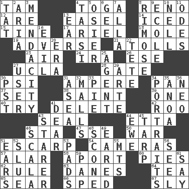 ACROSS 1. Scottish cap 4. Ancient Roman robe 8. Former U.S. Attorney General Janet 12. "We ___ not amused" (Victoria) 13. Artist's stand 14. On the rocks 15. Prong on a fork 17. Satellite of Uranus 18. Undercover agent 19. Contrary to your interests or welfare 21. Ringlike coral islands and reefs 23. Wind 24. Retirement account (abbr.) 26. Compass dir. 27. Southern CA. univ. 28. Yard entry 30. 23rd letter of the Greek alphabet 31. Electrical Unit 34. Baking dish 37. Arrange properly for use 38. Virtuous person 39. Single 40. Attempt 41. Erase 42. Friend of Pooh 43. Lick closed 44. Singer James 46. R.R. building 47. Compass dir. 50. Armed conflict 51. Fortification 54. Devices for capturing images 57. Having or resembling wings 58. To the left, to Queeg 60. Sliced desserts 62. Governing power 63. Natives or inhabitants of Denmark 64. Afternoon social gathering 65. Wither 66. Drove too fast 67. Stealthy DOWN 1. Make lace 2. Operatic vocal solo 3. Ananias' fault 4. Tarsus (plural) 5. Flexible twig of a willow tree 6. Turn to the right 7. Silent film actress Nazimova 8. Full of chinks, cracks, or crevices 9. Learning spot: Fr. 10. 1994 drama film starring Jodie Foster 11. Lyric poems 13. Ewer handle 16. Morally bad or wrong 20. Period 22. Wig 25. Rep 27. One who makes use of a thing 29. Johnson of "Laugh-In" 30. Pacific Standard Time (abbr.) 31. At sea 32. Promenades 33. Sliced dessert 34. Likenesses of persons 35. Small Philippine buffalo 36. Modern: prefix 41. Letter starter 43. A viewer who gazes fixedly 44. She-sheep 45. Canvas cover 46. Any of the three canals of the cochlea 48. Biscuitlike quick bread 49. Having ears or earlike features 51. Hearing organs 52. Change direction abruptly 53. Writing tablets 55. Mountains (abbr.) 56. Sew up the eyelids of hawks and falcons 59. Infant food 61. Declare