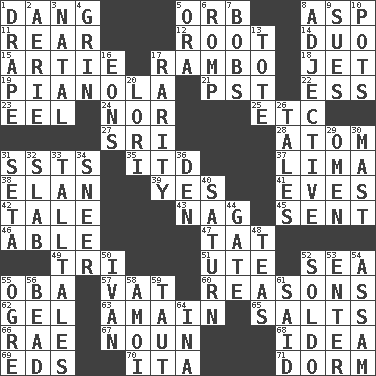 ACROSS 1. Mild oath, euphamism for damn 5. Globe 8. Cleo's killer 11. Hitchcock's "____ Window" 12. Carrot, for example 14. Superhero pair 15. Nick name for Arthur 17. Role for Stallone 18. Passenger plane 19. Player piano 21. Pacific Standard Time (abbr.) 22. Curvy letter 23. Snakelike fish 24. And not 25. And so on (abbr.) 27. Indian title of respect (Mr.) 28. Tiny particle 31. Fast planes 35. It would 37. Pale green bean 38. Enthusiasm 39. Consenting reply 41. Nights before holidays 42. Falsehood 43. Tired old horse 45. Emitted 46. Competent 47. Make lace 49. Three (prefix) 51. Shoshoni 52. Ocean 55. Chief or king in Benin or Nigeria 57. Large container 60. Thinks logically 62. Set 63. At full speed 65. Table seasonings 66. Actress Charlotte 67. Part of speech 68. The main thing one is thinking about 69. Begley and Asner 70. Call ___ day 71. Dormintory (informal) DOWN 1. Window treatment 2. Nest on high 3. Relating to or accompanying birth 4. Amused look 5. Mouth or opening 6. Play 7. Moves up and down 8. Descriptive word 9. Takes to court 10. Cooking vessels 13. Lug 16. Immeasurably long periods of time 17. Noteworthy scarcity 20. Australian parrot (variant) 26. Lies 29. Sign of things to come 30. Vertical spar for supporting sails 31. Bristle 32. Broad, flat, thick piece 33. Baron Munchausen's specialties 34. Contemptuous expression 36. Lair 40. Titan orbits this 44. Yard entry 48. Afternoon social gatherings 50. _ the terrible 52. Twentieth part of a lira 53. Keyboard key 54. Indian state 55. Legendary monster 56. Necklace unit 58. Mine, in Marseilles 59. Drawn tight 61. Stated 64. _ tizzy (2 wds.)