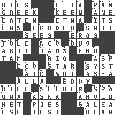 ACROSS 1. Lubricates 5. Singer James 9. Baking dish 12. Of Greece 14. Peachy ____! 15. One (Scot) 16. Consumed 17. Inactive volcano in Sicily 18. ___ a Wonderful Life 19. Followers of ems 20. Worn away 23. In a ____ (agitated or irritated) 24. Observes 25. Greek god of love 27. Lacquered or enameled metalware 30. Non-commissioned officer (abbr.) 32. Superhero pair 33. "This won't hurt ____!" 34. Scottish caps 36. Conclusion 38. Scottish cap 39. _ de Janeiro 40. Cleo's killer 43. Environmental prefix 46. Play the lead 48. System (abbr.) 49. Help 51. Indian title of respect (Mr.) 52. Toward the sea 53. Silent film actress Nazimova 54. Whirlpool 56. Land elevation 58. Sowing specialist 61. Health resort 64. Mouth or opening 65. "____ silly question..." 66. Hold, grip (Informal) 68. Was introduced to 69. Sliced desserts 70. An organ shaped like a helmet 71. Compass dir. 72. Trial 73. Letter starter DOWN 1. Double curve, resembling the letter S 2. SW Asia republic 3. Allows 4. Perceive with the eye 5. Supplemented with great effort 6. False hair 7. Looked after 8. Santa ___, CA 9. Aches 10. Against 11. A home for chicks 13. Leg joint 21. Monthly bill 22. Motion picture awards 23. Within a short period 24. Arrange properly for use 26. Regret 27. Make lace 28. Chief or king in Benin or Nigeria 29. Citrus frut 31. Leaves out 35. Flew 37. 24-hour periods 41. Compass dir. 42. Parent Teacher Assoc. 44. Give a ring to 45. Lubricate 47. Travel on an animal 48. Declare 50. Small ungulate mammals of Africa 53. Having winglike extensions 55. To be drawn or hauled along 56. Residence 57. Angers 59. Makes supply last 60. 90 degrees 61. Flatfish 62. Entreaty 63. The sixth month of the Jewish calendar 65. Fitting 67. Possessed