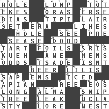 ACROSS 1. Hero or heavy, e.g. 5. Mass 9. Small child 12. Supplements with great effort 13. Mouths or openings 14. Celtic language 15. Prejudice 16. Native american tent (variation) 17. Den 18. Put into a specified state 19. Epoch 21. Citrus fruits 22. Hollow 24. Observe 26. Before (prefix) 27. Gospel singer Marvin 28. Texas town _ City 29. Small pie 30. Fencing necessities 32. Indian titles of respect 36. Malaysian steamed pastry 37. A saturated hydrocarbon 38. Not women's 39. Likelihood 40. Sadhe (variant) 42. Is not 43. Fermented drink made from hops 44. Ms. Damita and namesakes 46. Plant excrement 49. Followers of ems 50. On the rocks 51. Bee-related 53. To separate or throw off 54. Greek goddess of the dawn 57. Having great length 58. _ mater 61. Clip 62. Family _ (genealogy) 63. Path through which fluid escapes 64. Southern CA. univ. 65. Filthy place 66. Old wives' tales, e.g. 67. Egg locale DOWN 1. Confederate soldiers (slang) 2. Migrant worker of the '30s 3. Tough but pliablecoriaceous 4. Double-curved letter 5. Globular water bottle used in Asia 6. RI univ. 7. Atlas unit 8. 23rd letter of the Greek alphabet 9. _____ steamer (cargo ship) 10. Flexible twig of a willow tree 11. Laconic 14. Biblical high priest 19. Raised railways 20. Coral collection 21. Directed 23. Expletives 24. Having a sole or soles 25. Begley and Asner 27. Saudi Arabian king (1953-1964) 28. Middle Eastern gold or silver currency 29. Ring climax 31. Fertile tracts in a desert 32. Grin 33. Home 34. Lodging establishments 35. Fast jet (abbr.) 40. Nine, plus one 41. Writer Wiesel 43. Benjamin's nick name 45. Frozen water 46. Table seasonings 47. To the left, to Queeg 48. Abounding in pines 52. Mature 53. Libertine 55. Petroleums 56. Petty quarrel 58. Everything 59. Lion 60. Make imperfect 61. Player for Phoenix