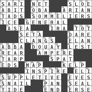 ACROSS 1. Indian skirt 5. Fish or hair follower 8. A type of plum 12. "This won't hurt ____!" 13. Chief or king in Benin or Nigeria 14. Believer in; advocate of (suffix) 15. Small boys 16. Wine waiters 19. Frozen water 20. Commissioned military rank 21. Toward the sea 23. Retirement account (abbr.) 24. Small child 27. Stalk of a moss capsule 30. Have the gumption 31. Rings like a ship's bell 34. Flair 35. Swedish rock group 38. A city in N France, SE of Calais 40. For fear that 41. Located in or toward the back 42. Electrical Unit 44. Canvas cover 45. Petty quarrel 46. Begley and Asner 47. Atlas unit 50. Seaweed 53. Stimulate to action 57. Biblical high priest 59. Supplying deficiencies 63. Nights before holidays 64. Slow-paced one 65. Baking dish 66. Lick closed 67. Periodic rise and fall of the sea level 68. Conclude 69. Celtic language DOWN 1. Suttee (variant) 2. Phillipine bananalike plant 3. Amusement-park features 4. It is 5. Characteristic smell of wine 6. Inky black, to poets 7. Docile 8. Indian title of respect (Mr.) 9. Falsehood 10. Rowing implement 11. Followers of ems 14. Silent film actress Nazimova 17. Medical imaging device (abbr.) 18. Ewer handle 20. Highlander 22. Fortification 24. Lie 25. Mouths or openings 26. Portable shelter 28. Bit 29. Small Philippine buffalo 30. Erase 32. Chewing product 33. Plant excrements 35. Johnson of "Laugh-In" 36. Necklace unit 37. Taverns 39. Slangy assent 43. Libertine 47. Place where flour is made 48. One (Scot) 49. Pacific Standard Time (abbr.) 51. Prying instrument 52. Entreaties 54. Corncob 55. "Terrible" tsar 56. Tear apart 58. Capri or Wight 59. Fast jet (abbr.) 60. Single; one (prefix) 61. Groovy apt. 62. Sliced dessert 63. Compass dir.