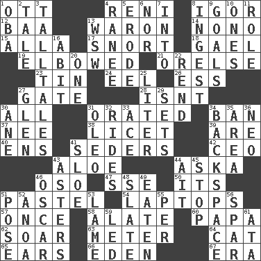 ACROSS 1. Baseball player Mel 4. Painter Guido (1575-1642) 8. Russian composer Stravinsky 12. Sound made by sheep 13. Make _____ (do battle with) 14. Words to Nanette 15. Silent film actress Nazimova 17. Derisive sound 18. Highlander 19. Turned at an angle; bent 21. Threatening words 23. Metal container 24. Snakelike fish 26. Curvy letter 27. Yard entry 28. Is not 30. Everything 31. Declaimed 34. Prohibit 37. Born 38. It is permitted: Lat. 39. "We ___ not amused" (Victoria) 40. Followers of ems 41. Spring feasts 42. Corporate head (abbr.) 43. _ vera 44. "____ silly question..." 46. Bear (Spanish) 47. Compass dir. 50. It is 51. Soft color 54. Portable computers 57. At one time in the past 58. Having winglike extensions 60. Dad 62. Fly high 63. Distance measurement 64. Feline 65. Hearing organs 66. Genesis locale 67. Epoch DOWN 1. Chief or king in Benin or Nigeria 2. Falsehood 3. Baron Munchausen's specialties 4. Indian princess (variant) 5. Wear away 6. Not either 7. To the inside or interior of 8. Consume 9. Finish lines 10. Singles 11. Hero or heavy, e.g. 13. Compass dir. 16. "This won't hurt ____!" 20. Single 22. Tear apart 25. 61 cubic inches 27. Small, secluded valley 29. Arranges properly for use 30. One (Scot) 31. Margarine 32. Amusement-park features 33. Adept person 34. Keyboard key 35. Type of rug 36. Modern: prefix 41. A type of plum 43. Michaelmas daisies 44. Small island 45. Halt 46. Motion picture award 48. Schedule 49. Eroded 51. Airs 52. Small Philippine buffalo 53. Unable to walk 55. For each 56. Practice fight 59. Directed 61. _ moment's notice (2 wds.)