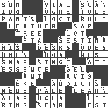 ACROSS 1. Player for Phoenix 4. Small bottle 8. Examine minutely or intensely 12. Wedding promise 13. Legendary monster 14. Lacquered or enameled metalware 15. Leg coverings 18. Event scenes 19. Court order 20. Cordwainer's material 22. Plant excrement 23. Relationship diagram 24. Car dealer's back yard 25. Parent Teacher Assoc. 26. French poetic form 30. Part of HMS, perhaps 33. Writing tables 36. Lyric poems 37. Washington bills 39. ___ good deed 40. Tender 41. Fastener 42. Scorch 44. Had dinner 45. Center 47. Set 50. Cuckoo 51. Advice 53. Supplement with great effort 54. Inveterate users 57. Ancient Persian 59. Light colored 61. Acquire or gain knowledge or skills 63. Having or resembling wings 64. Southern CA. univ. 65. Whopper 66. Basketball hoops 67. Dry up 68. Eastern Standard Time (abbr.) DOWN 1. Small drink 2. Freehold land 3. Music written for nine 4. Short-tailed, large-bodied rat 5. Russian composer Stravinsky 6. Curve 7. Luau accessory 8. Ski resort town in Vermont 9. Clever action or accomplishment 10. 100% 11. Born 16. Canvas cover 17. Proofreading order 21. Froth on beer 22. Mayday 24. French article 26. Heroin 27. The main thing one is thinking about 28. Egg locale 29. American tennis player Robert 30. Flexible conduit 31. Lodging establishments 32. Oceans 34. Singer Brickell 35. Male child 38. Orators 42. _-fi 43. Mild oath 46. Compass dir. 48. Morally bad or wrong 49. Louse (plural) 52. Showing deterioration from age 53. Dutch treat 54. Silent film actress Nazimova 55. Letter starter 56. Indian titles of respect 57. Make imperfect 58. Connecticut Ivy Leaguer 59. Fluid product of inflammation 60. Adept person 62. Fish or hair follower