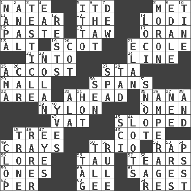 ACROSS 1. Nathan's nickname 5. It would 8. Was introduced to 11. Approach 13. Definite Article 14. Farming town in central California 15. Thick mixture 16. The 23rd letter of the Hebrew alphabet 17. NW Algerian seaport 18. The first octave above the treble staff 19. Native of Scotland 21. Learning spot: Fr. 22. To the inside or interior of 24. Actor's bit 25. Buttonhole 27. R.R. building 29. Shopping center 30. Connects, as a bridge 32. Type of rug 33. Toward the future 35. Grandmother 39. Thermoplastic polyamide 41. Sign of something about to happen 42. Large container 43. Slanted 45. Family _ (genealogy) 48. ____ d'Azur (French Riviera) 49. Trading vessels 50. Musical group of three 52. Strike 55. Old wives' tales, e.g. 56. The 19th letter of the Greek alphabet 57. Pulls apart 59. Singles 60. 100% 61. Gurus 62. For each 63. Unit of force equal to gravity 64. Repose DOWN 1. California wine valley 2. Of or related to the anus 3. A testis 4. Consume 5. "Tell ____ the Marines!" 6. Not this but _ 7. Morning condensation 8. Person of subnormal intelligence 9. Peak District village in England 10. Prong on a fork 12. Musical pauses 14. Locales 20. Small bed 21. Liveliness 23. Pitcher Ryan 25. Wet nurse (var.) 26. 4-wheeled motor vehicle 27. Health resort 28. Small amount or degree 30. Elected rep. 31. Snob 33. In the manner of 34. Being at a high temperature 36. Electrical Measurement 37. Born 38. Added to 40. Jacques Cousteau's middle name 43. _-fi 44. Plunders 45. Heavy duty weighing machine 46. More valued for its uncommonness 47. Sight organs 49. Hoof sound 50. Story 51. Court order 53. Ancient Greek god of war 54. Inconspicuous attention getter 56. Label 58. Hearing organ