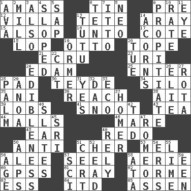ACROSS 1. Collect or gather 6. Shallow baking pan 9. Before (prefix) 12. Country residence 13. Wig 14. Like ___ of sunshine 15. Columnist Joseph or Stewart 16. To (old English) 17. ____ d'Azur (French Riviera) 18. Chop off 19. Von Bismarck 20. Drink excessively 21. Shade of tan 23. RI univ. 24. Dutch treat 25. Keyboard key 28. Groovy apt. 30. Miss Universe 1986, Barbara Palacios _ 34. Grain storage tower 35. Cuckoo 36. Arrive at 38. Small island 39. Tennis shots 41. Snob 43. Afternoon social gathering 44. Shopping centers 46. Female horse 48. Ewer handle 49. Redecorate 50. Opposed to 51. "Mermaids" star 53. Cartoonist voice _ Blanc 56. Toward shelter 57. Sew up the eyelids of hawks and falcons 58. Nest on high 60. Global Positioning Systems (abbr.) 61. Supercomputer manufacturer 62. Singer Mel 63. Curvy letter 64. It would 65. NE Netherlands city DOWN 1. Actress Gardner 2. Place where flour is made 3. In addition 4. Had an oblique or slanted direction 5. Plant excrement 6. Portable shelter 7. "Tell ____ the Marines!" 8. Modern: prefix 9. Appease 10. Assign a rank or rating to 11. Sight organ 13. Ballerina skirt 14. Oak nuts 19. Abalone 20. Third day of the wk. 22. Domesticated feline 24. The property of being fit to eat 26. Writer Wiesel 27. Round or rotation of duties 28. Inside of hand 29. Small Philippine buffalo 31. Affirmative reply 32. Daniel's nick name 33. Environmental prefix 37. Home run 40. Chalkboards 42. Small amount or degree 45. Indian title of respect (Mr.) 47. Lover boys 49. Have trust in 50. High mountains 51. Sure thing 52. Froth on beer 54. Blunders 55. Citrus frut 56. Grow older 57. _-fi 58. _ moment's notice (2 wds.) 59. Car or cant ending