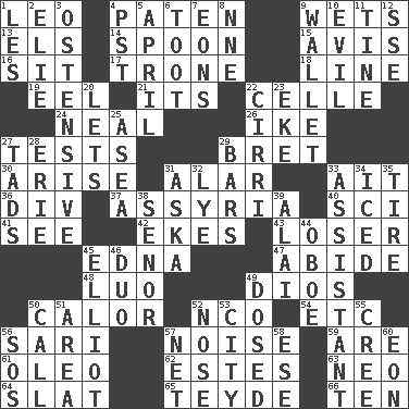 ACROSS 1. Lion 4. Eucharist need 9. Soaks 13. Raised railways 14. Soup utensil 15. Opinion 16. Be seated 17. Heavy duty weighing machine 18. Actor's bit 19. Snakelike fish 21. It is 22. Cell (Danish) 24. Anneal 26. Mamie's husband 27. Trials 29. Cy Young winner Saberhagen 30. Get up 31. Having or resembling wings 33. Small island 36. HTML Container Element 37. Nineveh was its capital 40. _-fi 41. Perceive with the eye 42. Supplements with great effort 43. Failure 45. Pulitzer Prize-winning author Ferber 47. Remain 48. Nilotic language 49. "Vaya con ____" 50. Bodily heat indicating an inflammation 52. Non-commissioned officer (abbr.) 54. And so on (abbr.) 56. Indian skirt 57. Annoying sound 59. "We ___ not amused" (Victoria) 61. Butter sub 62. _____ Park, CO 63. Modern: prefix 64. Narrow board 65. Miss Universe 1986, Barbara Palacios _ 66. "___ Little Indians" DOWN 1. French article 2. Writer Wiesel 3. Clearly or manifestly demonstrative 4. Pacific Standard Time (abbr.) 5. Showery time 6. A blast of a horn 7. Immeasurably long periods of time 8. Compass dir. 9. Place for singles 10. Morally bad or wrong 11. Prong on a fork 12. Compass dir. 20. Allows 22. High-altitude cloud 23. Supplement with great effort 25. Toward the sea 27. Bits 28. 4th largest of the Great Lakes 29. Taverns 31. "____ silly question..." 32. Sodium hydroxide 33. Aide 34. On the rocks 35. Hoop that covers a wheel 38. Sir (Sp.) 39. Mountain range southwest of Kyrgyzstan 44. Mitch Miller's instrument 45. American author Paul (1891-1958) 46. Superhero pair 49. Administered medicine 50. Give a ring to 51. Length times width 52. Olfactory organ 53. Municipality 55. Algonquian 56. Mayday 57. Remaining after all deductions 58. Compass dir. 60. A really long time