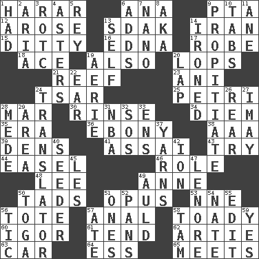 ACROSS 1. Ethiopian city, capital of Harari 6. Santa ___, CA 9. Parent Teacher Association (abbr.) 12. Came up 13. Neighbor of Neb. 14. SW Asia republic 15. Short, simple song 16. Pulitzer Prize-winning author Ferber 17. Loose flowing garment 18. Adept person 19. In addition 20. Chops off 21. Coral ridge 23. Cuckoo 24. Russian ruler of old 25. _ dish (used to culture cells) 28. Make imperfect 30. Wash lightly 34. South Vietnam president (1954) 35. Period 36. Dark wood 38. Auto club (abbr.) 39. Habitations of wild animals 41. Slender Brazilian palm 43. Attempt to accomplish something 44. Artist's stand 46. Hero or heavy, e.g. 48. Area sheltered from the wind 49. Queen of England 1702-14 50. Small amounts or degrees 51. Musical composition 53. Compass dir. 56. Carry 57. Of or related to the anus 58. Sycophant 60. Russian composer Stravinsky 61. Look after 62. Nick name for Arthur 63. Automobile 64. Double-curved letter 65. Confronts DOWN 1. Possessed 2. Operatic vocal solo 3. College mil. group 4. Michaelmas daisies 5. Marina Del _, California 6. Sums up 7. Billionth: prefix 8. Alias (abbr.) 9. Appease 10. Bar bills 11. One (Scot) 13. Itself 14. Pressed 19. Nest on high 20. Pet locale 22. Hearing organ 24. Interpreter 26. Stern 27. "If ____ say so..." 28. Ancient Persian 29. Length times width 31. Basketball assoc. 32. Distress signal 33. Followers of ems 37. Entertaining tales 40. Sowing specialist 42. Electrically charged atom 45. French article 47. Poe poem 49. Old (Scot.) 50. Ancient Roman robe 51. Singles 52. Baking dishes 54. Nathan's nickname 55. Prepare for publication 56. Nervous spasm 57. Had dinner 58. Scottish cap 59. Consenting reply