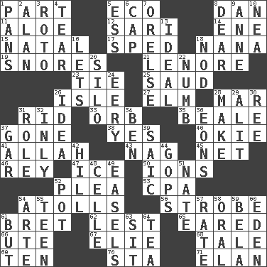 ACROSS 1. Piece 5. Environmental prefix 8. One of the 12 tribes of Israel 11. _ vera 12. Indian skirt 14. Compass dir. 15. Brizilian seaport 17. Broke a traffic law 18. Grandmother 19. Sounds asleep 21. Poe poem 23. Standoff 25. Saudi Arabian king (1953-1964) 26. Small island 27. Shade tree 28. Third mo. 31. To free from 33. Globe 35. Memphis, Tenn. Street 37. Went 38. It is so 40. Migrant worker of the '30s 41. Assad's deity 43. Tired old horse 45. Fish or hair follower 46. Marina Del _, California 47. Frozen water 50. Charged particles 52. Entreaty 53. Accounting whiz (abbr.) 54. Ringlike coral islands and reefs 56. Disco prop 61. Cy Young winner Saberhagen 62. For fear that 65. Having ears or earlike features 66. Shoshoni 67. Writer Wiesel 68. Falsehood 69. Nine, plus one 70. R.R. building 71. Style DOWN 1. Baking dishes 2. Actor Alda or Thicke 3. Printing process, for short 4. Rend 5. Curvy letter 6. Head covering 7. Threatening words 8. Letter starter 9. Singer Murray 10. Teachers' org. 13. Standard of perfection 16. Allows 18. Lower and raise head in agreement 20. Grain storage tower 22. Unfeeling 24. Suggestive of the supernatural 26. It may be bright or harebrained 28. Create 29. Set down 30. To sift 31. Hero or heavy, e.g. 32. Inwardly 34. Benjamin's nick name 36. Immeasurably long periods of time 37. Slender fish 39. Ketch in the Levant 42. Land elevation 44. Republicans 48. Cell (Danish) 49. Artist's stands 51. Nathan's nickname 52. Cooking vessel 54. Johnson of "Laugh-In" 55. Adolescent 57. Assign a rank or rating to 58. Of the mouth 59. Actor Lugosi 60. Paradise 61. With the exception that 63. Be seated 64. Afternoon social gathering