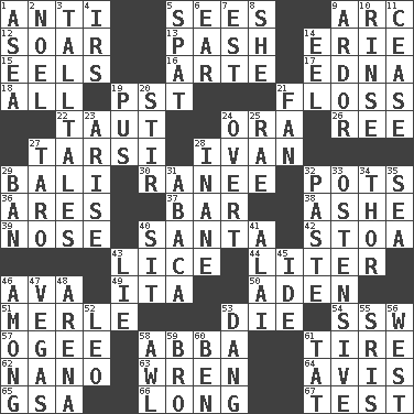 ACROSS 1. Opposed to 5. Perceives with the eye 9. Curve 12. Fly high 13. Romantic infatuation 14. One of the Great Lakes 15. Snakelike fish 16. Johnson of "Laugh-In" 17. Pulitzer Prize-winning author Ferber 18. 100% 19. Pacific Standard Time (abbr.) 21. Soft thread for cleaning between teeth 22. Drawn tight 24. Mouth or opening 26. To riddle 27. Tarsus (plural) 28. "Terrible" tsar 29. Indonesian resort city 30. The wife of a rajah (variant) 32. Cooking vessels 36. Ancient Greek god of war 37. Oblong piece of solid material 38. American tennis player Robert 39. Characteristic smell of wine 40. Before Barbara or Clara 42. Portico 43. Louse (plural) 44. 61 cubic inches 46. Actress Gardner 49. Call ___ day 50. Arabian gulf 51. Haggard of country music 53. Expire 54. Compass dir. 57. Double curve, resembling the letter S 58. Swedish rock group 61. Hoop that covers a wheel 62. Billionth: prefix 63. Songbird 64. Advice 65. Girls' org. (abbr.) 66. Yearn 67. Trial DOWN 1. At sea 2. Christmas carol 3. Baron Munchausen's specialties 4. Big collection agency 5. Argument over a trivial matter 6. Hearing organ 7. Eastern Standard Time (abbr.) 8. A female animal or person 9. Zeal 10. Wash lightly 11. Stop 14. Snakelike fish 19. Fluid product of inflammation 20. Move through with a circular motion 21. Air blower 23. Originate 24. Unconcealed 25. Actress Charlotte 27. Pacific island yam 28. Empty; void 29. Prohibit 31. Phillipine bananalike plant 32. Thick mixture 33. Clearly or manifestly demonstrative 34. Son of Odin 35. Ocean 40. Be seated 41. Mountain range southwest of Kyrgyzstan 43. Falsehood 45. Binary compound 46. Amid 47. Viva Las _ 48. Sports stadium 52. Lion 53. Mild oath, euphamism for damn 55. Indian titles of respect 56. Compass direction 58. Leather borer 59. Sis' sibling 60. Benjamin's nick name 61. Make lace