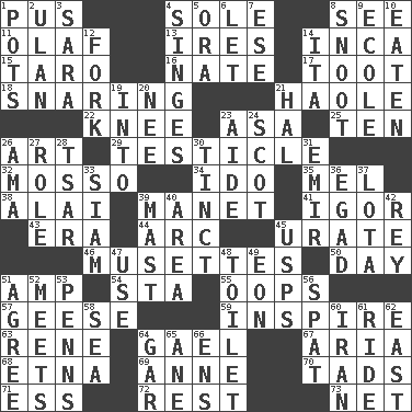ACROSS 1. Fluid product of inflammation 4. Not divided or shared with others 8. Observe 11. Norwegian king 13. Angers 14. South American Indian 15. Pacific island yam 16. Nathan's nickname 17. A blast of a horn 18. Catching in a trap 21. White Person, in Hawaii 22. Leg joint 23. White ___ sheet 25. Nine, plus one 26. Nonscientific branch of learning 29. One of the two male reproductive glands 32. With motion or animation 34. Wedding promise 35. Cartoonist voice _ Blanc 38. Jai ____ 39. French painter Edouard 41. Composer Stravinsky 43. Period 44. Curve 45. A salt of uric acid 46. French bagpipes 50. 24 hours 51. Electrical Unit 54. R.R. building 55. I made a mistake 57. Honkers 59. Heighten or intensify 63. French philosopher Descartes 64. Highlander 67. Roberta Peters solo 68. Inactive volcano in Sicily 69. Singer Murray 70. Small amounts or degrees 71. Curvy letter 72. Relief 73. Remaining after all deductions DOWN 1. Cooking vessels 2. Uhlan (variant) 3. "Two Mules for Sister ____" 4. Scorches 5. Mouth or opening 6. Allow 7. Compass dir. 8. Snout, nose 9. Learning spot: Fr. 10. Ingested 12. Tined utensil 14. Call ___ day 19. To the inside or interior of 20. Born 21. Actor Linden 23. Assistant 24. Highlander 26. Nursemaid (var.) 27. Hero or heavy, e.g. 28. Russian ruler of old 30. A color or tint 31. Independent ruler or chieftain 33. Thailand, formerly 36. Mild oath 37. Globular water bottle used in Asia 39. Vertical spar for supporting sails 40. Type of rug 42. Marina Del _, California 45. United States Postal Service (abbr.) 47. Purpose 48. Bathroom 49. A really long time 51. Match 52. Confronts 53. Actor Sean's family 56. Petty quarrel 58. Ocean 60. SW Asia republic 61. Travel on or in a vehicle 62. 90 degrees 64. Slender fish 65. One (Scot) 66. Followers of ems