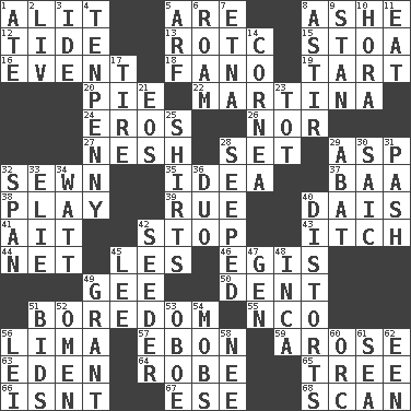 ACROSS 1. Came down and settled, as after flight 5. "We ___ not amused" (Victoria) 8. American tennis player Robert 12. Periodic rise and fall of the sea level 13. College mil. group 15. Portico 16. Incident 18. Papal veil 19. Small pie 20. Sliced dessert 22. Chrissie's court nemesis 24. Greek god of love 26. Not either 27. Soft 28. Arrange properly for use 29. Cleo's killer 32. Stitched 35. The main thing one is thinking about 37. Sound made by sheep 38. Romp 39. Regret 40. Raised platform 41. Small island 42. Halt 43. Hankering 44. Remaining after all deductions 45. French article 46. The front part of a cuirass 49. Turn to the right 50. Gouge 51. Mood resulting from idleness 55. Non-commissioned officer (abbr.) 56. Pale green bean 57. Inky black, to poets 59. Came up 63. Genesis locale 64. Loose flowing garment 65. Relationship diagram 66. Is not 67. Compass dir. 68. Skim DOWN 1. Had dinner 2. 54 in ancient Rome 3. Binary compound 4. 3-inch nail 5. Sandy's bark 6. Wander aimlessly 7. Inactive volcano in Sicily 8. Being in motion 9. Comedian Laurel of Laurel & Hardy 10. Israeli folk dance 11. Ingest 14. Pupil covering 17. Hoop that covers a wheel 21. Greek goddess of the dawn 23. Small child 25. Upper-body garments 28. Oozed 29. Blind as ____ 30. Ketch in the Levant 31. Romantic infatuation 32. Connect, as a bridge 33. Writer Wiesel 34. Electrical Unit 36. Superhero pair 40. What propaganda does 42. Sowing specialist 45. Area sheltered from the wind 47. Commissioned mil. rank 48. South American Indian 49. Monetary aid 51. Auction offers 52. Sign of things to come 53. Mitch Miller's instrument 54. Crowds into 56. Luau accessory 58. Born 60. The grampus (Milton) 61. Ocean 62. Car or cant ending