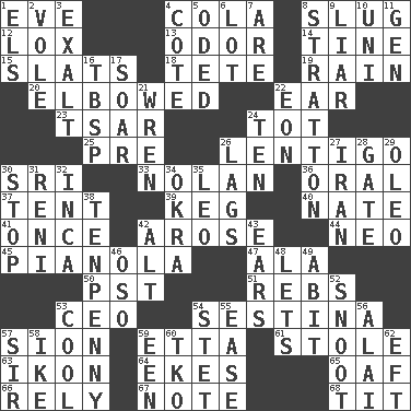 ACROSS 1. First lady 4. Root beer relative 8. Strike heavily 12. Brine-cured salmon 13. Aroma 14. Prong on a fork 15. Narrow boards 18. False hair 19. Water falling in drops from the sky 20. Shoved, as through a crowd 22. Hearing organ 23. Russian ruler of old 24. Small child 25. Before (prefix) 26. Small, flat, pigmented spot on the skin 30. _ Lanka 33. Pitcher Ryan 36. Spoken 37. Portable shelter 39. Barrel 40. Nathan's nickname 41. Single time 42. Came up 44. Modern: prefix 45. Player piano 47. Insect wing 50. Pacific Standard Time (abbr.) 51. Confederate soldiers (slang) 53. Corporate head (abbr.) 54. French poetic form 57. The Jewish people; Israel 59. Singer James 61. Took without asking 63. Image 64. Supplements with great effort 65. Clumsy lout 66. Depend 67. Musical sound 68. Teat (slang) DOWN 1. Raised railways 2. Short-tailed, large-bodied rat 3. Glorify 4. ____ d'Azur (French Riviera) 5. Wrote a lyric poem 6. Car dealer's back yard 7. "We ___ not amused" (Victoria) 8. Ski resort town in Vermont 9. One who doesn't tell the truth 10. Corn or form start 11. Commissioned mil. rank 16. Cook's measure (abbr.) 17. Fly high 21. Songbird 22. Period of immesurable duration 24. "___ Little Indians" 26. Fails to keep up a pace 27. SW Asia republic 28. Yard entry 29. Margarine 30. Constrict 31. Painter Guido (1575-1642) 32. South American Indian 34. Gumbo ingredient 35. Lion 38. 3-inch nail 42. The first octave above the treble staff 43. Hearing organs 46. Bear (Spanish) 48. Allows 49. "This won't hurt ____!" 52. Snout, nose 53. Calm and collected 54. Proofreading order 55. Relaxation 56. Jai ____ 57. Title for a knight 58. Mamie's husband 59. Car or cant ending 60. Ring climax 62. Newt