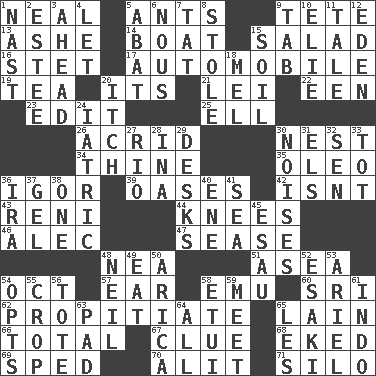 ACROSS 1. Be tempered by heat 5. Pismires 9. False hair 13. American tennis player Robert 14. Water vessel 15. Vegetable dish 16. Proofreading order 17. Form of transportation 19. Afternoon social gathering 20. It is 21. Flowery wreath 22. Car or cant ending 23. Prepare for publication 25. Pipe bend 26. Bitter 30. Egg locale 34. One or ones belonging to thee 35. Margarine 36. Composer Stravinsky 39. Fertile tracts in a desert 42. Is not 43. Painter Guido (1575-1642) 44. Leg joints 46. Actor Baldwin 47. Gospel singer Marvin 48. Teachers' org. 51. At sea 54. Sep. follower 57. Ewer handle 58. Australian flightless bird 60. Indian title of respect (Mr.) 62. Appease 65. (Had) reclined 66. Add up to 67. A slight indication 68. Supplemented with great effort 69. Drove too fast 70. Set down 71. Grain storage tower DOWN 1. Political cartoonist Thomas 2. First name in cosmetics 3. Forward in time 4. Allow 5. Blind as ____ 6. Common sense 7. Make lace 8. Fur scarf 9. Bar bill 10. Writer Wiesel 11. Lie 12. Genesis locale 15. Earth 18. Cartoonist voice _ Blanc 20. Hankering 24. Of or pertaining to medicine 27. _ de Janeiro 28. _ tizzy (2 wds.) 29. Writing tables 30. Annoying sounds 31. Raised railways 32. Elected rep. 33. Small child 36. Retirement account (abbr.) 37. Set 38. Single 40. Compass dir. 41. Ocean 45. Son of Isaac 48. Famous astronaut Armstrong 49. Consume 50. N. Chile seaport 52. 1973 Nobel Price Winner (Physics) Leo 53. Satellite of Uranus 54. Elects 55. Riding implement 56. Haul 58. Needle case 59. Confront 61. _ china 63. Writing tablet 64. 100% 65. French article