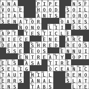 ACROSS 1. Santa ___, CA 4. Corncob 8. Overdraft (abbr.) 11. Grand slam 13. Parka part 14. Earth 15. Slanted text style (abbr.) 16. Pismires 17. "Corrida" creature 18. Elected representative 21. Fertile tracts in a desert 22. Words to Nanette 23. Cards in a Roman deck? 25. Double-curved letter 26. Fitting 29. A testis 32. Sibling's daughter 34. Compass dir. 35. Curve 38. Letter starter 39. Tear up 41. Vintage cars 43. Compass dir. 44. Greek goddess of the dawn 45. World-weariness 46. Plea 50. Elect 51. Raised railways 54. White ___ sheet 55. Become fatigued 57. Former Milwaukee Brewers owner Bud 59. Pertaining to the sea 63. Strained 64. Place where flour is made 67. San ____ (Riviera town) 68. Blunders 69. Of or related to the anus 70. Narrow board 71. Followers of ems 72. Bar bills 73. Potassium hydroxide DOWN 1. Advice 2. Musical sound 3. ____ Jay Lerner 4. N Egypt peninsula 5. Electrically charged atom 6. Cooking vessel 7. Begley and Asner 8. Trap for birds or small mammals 9. Fathers 10. Soft thread for cleaning between teeth 12. Liveliness 14. R.R. building 19. Carryall 20. Single 21. Lubricate 23. Actor's bit 24. On the rocks 26. Also 27. Sliced desserts 28. Beverages made from leaves 30. Laconic 31. Merit 33. Algonquian 36. Former U.S. Attorney General Janet 37. Overturn; upset 39. Arranges properly for use 40. Israeli folk dance 42. Be seated 45. Jane of fiction 47. Tired old horse 48. Ringlike coral islands and reefs 49. Nervous spasm 51. First name in cosmetics 52. Memorize 53. Disparaging remarks 56. Hearing organs 58. ___ a Wonderful Life 60. 1994 drama film starring Jodie Foster 61. "If ____ say so..." 62. ____ d'Azur (French Riviera) 64. Floor covering 65. _ tizzy (2 wds.) 66. Experiment locale