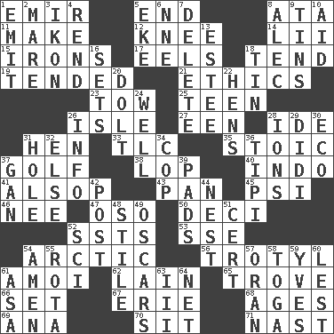 ACROSS 1. Arab leader 5. Conclude 8. _ moment's notice (2 wds.) 11. Cause to be 12. Leg joint 14. Cards in a Roman deck? 15. Metal shackles 17. Snakelike fish 18. Be inclined (to) 19. Watched over 21. Moral principles 23. Pull behind 25. Adolescent 26. Small island 27. Car or cant ending 28. Binary compound 31. Layer 33. Affectionate concern, for short 35. Unemotional 37. Eighteen holes 38. Trim (branches) 40. _ china 41. Columnist Joseph or Stewart 43. Baking dish 45. Air pressure measure (abbr.) 46. Born 47. Bear (Spanish) 50. Tenth: prefix 52. Fast planes 53. Compass dir. 54. Northern region 56. TNT 61. Mine, in Marseilles 62. (Had) reclined 65. Collection of objects 66. Put into a specified state 67. 4th largest of the Great Lakes 68. Ripens 69. Santa ___, CA 70. Be seated 71. Political cartoonist Thomas DOWN 1. Give off 2. Female horse 3. Image 4. Tear apart 5. Make supply last 6. Compass dir. 7. Erase 8. Actor Baldwin 9. Metal containers 10. Assist 13. First name in cosmetics 16. Puts into a specified state 18. Metal container 20. Dunce 22. Coop moms 24. Water source 26. A message received and understood 28. Charged particles 29. "You Light Up My Life" star Conn 30. Environmental prefix 31. Opening into or through something 32. Otherwise 34. Police officer (slang) 36. Native american tent (variation) 37. Separate the seeds from cotton 39. Writing tablets 42. Mail 44. Egg locale 48. Vertical member of a panel or frame 49. Motion picture awards 51. Foregone conclusion 52. _-fi 54. So be it 55. Roll call or roster of names 57. Northwest Algerian city 58. Ancient Roman robe 59. Jacques Cousteau's middle name 60. For fear that 61. White ___ sheet 63. One more than two 64. Fish or hair follower