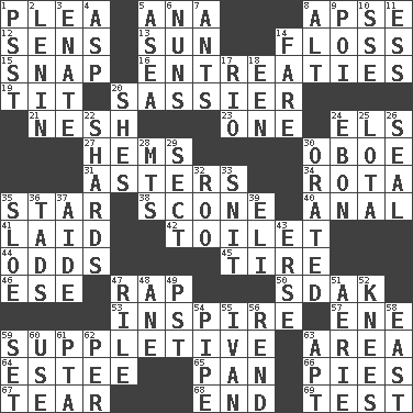 ACROSS 1. Entreaty 5. Santa ___, CA 8. Domed church section 12. Elected reps. 13. Player for Phoenix 14. Soft thread for cleaning between teeth 15. Fastener 16. Pleas 19. Teat (slang) 20. More impudent 21. Delicate 23. Single 24. Raised railways 27. Cloth borders 30. Mitch Miller's instrument 31. Michaelmas daisies 34. Roll call or roster of names 35. Play the lead 38. Biscuitlike quick bread 40. Of or related to the anus 41. Put down 42. Rest room 44. Probability 45. Become fatigued 46. Compass dir. 47. Hit sharply and swiftly 50. Neighbor of Neb. 53. Motivate 57. Compass dir. 59. Supplying deficiencies 63. Length times width 64. First name in cosmetics 65. Baking dish 66. Sliced desserts 67. Lacerate 68. Conclude 69. Trial DOWN 1. Inconspicuous attention getter 2. Soviet premier 1918-24 3. Related on the mother's side 4. Viper 5. Toward the sea 6. Religious women 7. Pismires 8. Keyboard modifier key 9. Luau course 10. Compass dir. 11. Double-curved letter 14. Conductor's collection 17. _ de Janeiro 18. Car or cant ending 20. "______ My Girl" (Turtles hit) 22. Pottery fragments 24. Inky black, to poets 25. Globular water bottle used in Asia 26. Lick closed 28. Mountains (abbr.) 29. Religious group 30. Declaimed 32. Friend of Pooh 33. In a ____ (agitated or irritated) 35. _ gin 36. Small boys 37. Assistant 39. Biblical high priest 43. Celtic language 47. Cause heat under the collar 48. A saturated hydrocarbon 49. Pacific Standard Time (abbr.) 51. Nest on high 52. Leg joints 54. Corncob 55. _ the terrible 56. Tear apart 58. Compass direction 59. Put into a specified state 60. Purpose 61. Parent Teacher Assoc. 62. For each 63. Fitting