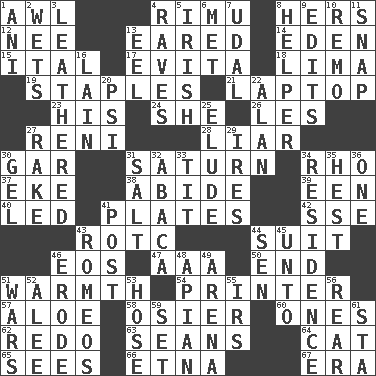 ACROSS 1. Leather borer 4. Tall New Zealand timber tree 8. Possessive pronoun 12. Born 13. Having ears or earlike features 14. Genesis locale 15. Slanted text style (abbr.) 17. Webber/Rice musical 18. Pale green bean 19. Paper fasteners 21. Portable computer 23. Part of HMS, perhaps 24. A female animal or person 26. French article 27. Painter Guido (1575-1642) 28. One who doesn't tell the truth 30. Slender fish 31. Titan orbits this 34. 17th letter of the Greek alphabet 37. Make supply last 38. Tolerate 39. Car or cant ending 40. Directed 41. Food holders 42. Compass dir. 43. College mil. group 44. Costume for a special activity 46. Greek goddess of the dawn 47. American Automobile Association (abbr.) 50. Conclude 51. Heat 54. Hard copy producer 57. _ vera 58. Flexible twig of a willow tree 60. Singles 62. Make new 63. Actors Connery and Penn 64. Domesticated feline 65. Observes 66. Inactive volcano in Sicily 67. Period DOWN 1. Black tropical American cuckoo 2. Moistens 3. Resembling or made to resemble leather 4. All-night dance parties 5. From or relating to Ireland 6. Was introduced to 7. Allodial 8. Aide 9. Proofreads 10. San ____ (Riviera town) 11. Fastener 13. Snakelike fish 16. (Had) reclined 20. 23rd letter of the Greek alphabet 22. ____ Jay Lerner 25. Dodge 27. Libertine 29. Angers 30. Set 31. Table seasoning 32. Phillipine bananalike plant 33. Teat (slang) 34. Dwelling 35. Command 36. Single 41. Mail 43. Lover boys 44. Elected rep. 45. To (old English) 46. Eat (away) 48. Bee-related 49. Sports stadium 51. Armed conflicts 52. Toward shelter 53. Flexible conduit 55. Big collection agency 56. Posterior 59. Put into a specified state 61. R.R. building