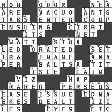 ACROSS 1. Not either 4. Scent 8. Ocean 11. "We ___ not amused" (Victoria) 12. In a vacuum (with "in") 14. Pismires 15. Bar bills 17. Keyboard key 18. Clever action or accomplishment 19. Taking place subsequently 21. High-altitude cloud 23. It is 24. Fish or hair follower 25. Electrical Unit 27. Portico 30. Directed 31. Declaimed 34. Put into a specified state 37. Lyricist Gershwin 38. Empty; void 39. Housemaid (var.) 40. For each 41. Greek mezzo-soprano Agnes 43. Teat (slang) 44. Small island 45. Den 47. Namely 49. Atlas unit 50. More uncommon 52. Son of Zeus who helped slay Medusa 56. Comfort 57. Come out of 60. Pulitzer Prize-winning author Ferber 61. Makes supply last 62. Started a card game 63. One more than two 64. French article 65. Snake ____ (dice throw) 66. And so on (abbr.) DOWN 1. Nathan's nickname 2. NW Algerian seaport 3. Confederate soldiers (slang) 4. Baking chambers 5. Mild oath, euphamism for damn 6. Sep. follower 7. Regret 8. Derisive sound 9. Needle case 10. Viper 13. The grampus (Milton) 14. 43,560 square feet 16. Set of matching outer garments 20. "Tell ____ the Marines!" 22. _ tizzy (2 wds.) 25. Past tense of be (plural) 26. The sixth month of the Jewish calendar 27. Having lost freshness 28. Portable shelter 29. Lyric poems 30. Mouth edge 32. Teases 33. Of or related to the anus 34. Suttee (variant) 35. Arab leader 36. Make lace 42. Having or resembling wings 44. Ending with capital 46. Domed church section 47. Flower holders 48. Angers 49. Confronts 50. Libertine 51. To free from 52. Whimper 53. Singer Brickell 54. A single undivided whole 55. Ketch in the Levant 56. Snakelike fish 58. Perceive with the eye 59. Declare