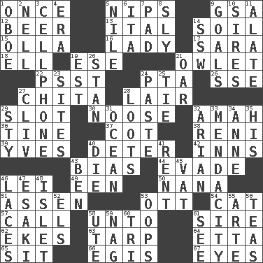 ACROSS 1. Single time 5. Cuts off 9. Girls' org. (abbr.) 12. Fermented drink made from hops 13. Slanted text style (abbr.) 14. Earth 15. Water jar 16. Kenny Rogers chart-topper in '80 17. "Two Mules for Sister ____" 18. Pipe bend 19. Compass dir. 21. A small or young owl 22. Inconspicuous attention getter 24. Parent Teacher Assoc. 26. Compass dir. 27. Riviera of "Kiss of the Spider Woman" 28. Den 29. Narrow, elongated depression 30. Trap for birds or small mammals 32. Housemaid 36. Prong on a fork 37. Small bed 38. Painter Guido (1575-1642) 39. Jacques Cousteau's middle name 40. Prevent from occurring 42. Restaurants 43. Prejudice 44. Dodge 46. Flowery wreath 49. Car or cant ending 50. Grandmother 51. NE Netherlands city 53. Baseball player Mel 54. Domesticated feline 57. Give a ring to 58. To (old English) 61. Title for a man of rank and authority 62. Makes supply last 63. Canvas cover 64. Singer James 65. Be seated 66. Armor plate that protects the chest 67. Sight organs DOWN 1. Mitch Miller's instrument 2. 1994 drama film starring Jodie Foster 3. Portable communications device 4. Period 5. "Death on the ____" 6. Call ___ day 7. Groovy apt. 8. Playfully artful 9. Scores awarded for successful feats 10. Fathers 11. Having winglike extensions 14. Compass dir. 19. Eastern Standard Time (abbr.) 20. Comedian Laurel of Laurel & Hardy 21. Rowing implement 23. Locates 24. Thick mixture 25. Neckwear 27. 154 in Roman numerals 28. Plunders 29. Filthy place 31. Sea 32. Believer in; advocate of (suffix) 33. Ananias' fault 34. Singer Murray 35. Part of HMS, perhaps 40. Pass on 41. Monthly bill 43. Benjamin's nick name 45. Large container 46. Shoestrings 47. 1973 Nobel Price Winner (Physics) Leo 48. Small island 52. Raised railways 53. I made a mistake 55. Johnson of "Laugh-In" 56. Afternoon social gatherings 58. Shoshoni 59. Tired old horse 60. Three (prefix) 61. Perceive with the eye