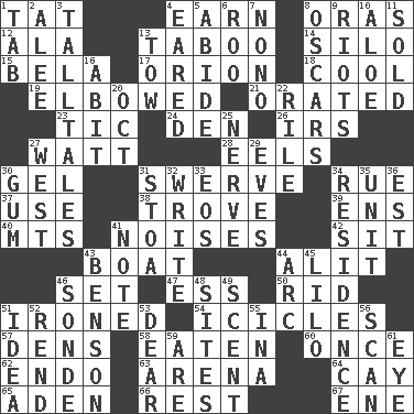 ACROSS 1. Make lace 4. Merit 8. Mouths or openings 12. Wing 13. Off limits 14. Grain storage tower 15. Actor Lugosi 17. Greek mythologigal hunter 18. Calm and collected 19. Shoved, as through a crowd 21. Spoke pompously 23. Nervous spasm 24. Lair 26. Big collection agency 27. Electrical Unit 28. Snakelike fish 30. Set 31. Turn aside suddenly 34. Sorrow 37. Purpose 38. Collection of objects 39. Followers of ems 40. Mountains (abbr.) 41. Annoying sounds 42. Be seated 43. Water vessel 44. Set down 46. Arrange properly for use 47. Curvy letter 50. To free from 51. Pressed 54. Winter's stalactites 57. Habitations of wild animals 58. Consumed 60. At one time in the past 62. Inside; within (prefix) 63. Sports stadium 64. Island 65. Arabian gulf 66. Relief 67. Compass dir. DOWN 1. Keyboard key 2. Toward shelter 3. Baron Munchausen's specialties 4. Having ears or earlike features 5. Remain 6. Friend of Pooh 7. Words to Nanette 8. Motion picture awards 9. Disturbances 10. _ vera 11. Disposed of to a purchaser 13. Pull behind 16. "This won't hurt ____!" 20. Sep. follower 22. Cause heat under the collar 25. Impudent aggressiveness 27. 270 degrees 29. Nights before holidays 30. Chewing product 31. Portico 32. Compose 33. Greek goddess of the dawn 34. Dwelling 35. A single undivided whole 36. Eastern Standard Time (abbr.) 41. Observe 43. Gillaume's butler role 44. Curve 45. _ and Stitch 46. Something which is sent 48. Locates 49. Odor 51. It may be bright or harebrained 52. Tear apart 53. Letter starter 55. _ tizzy (2 wds.) 56. Examine minutely or intensely 59. "We ___ not amused" (Victoria) 61. Sight organ