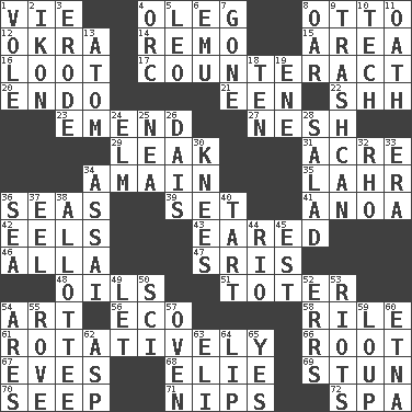 ACROSS 1. Compete 4. Cassini of fashion 8. "Beetle Bailey" pooch 12. Gumbo ingredient 14. San ____ (Riviera town) 15. Type of rug 16. Spoils 17. Act in opposition 20. Inside; within (prefix) 21. Car or cant ending 22. Quiet! 23. Make improvements or corrections to 27. Tender 29. Path through which fluid escapes 31. 1/640 square mile 34. With great haste 35. Cowardly lion portrayer 36. Oceans 39. Put into a specified state 41. Small Philippine buffalo 42. Snakelike fish 43. Having ears or earlike features 46. Silent film actress Nazimova 47. Indian titles of respect 48. Lubricates 51. Carrier 54. Tate display 56. Environmental prefix 58. Cause heat under the collar 61. Rotating or pertaining to rotation 66. Carrot, for example 67. Nights before holidays 68. Writer Wiesel 69. Astound 70. Ooze 71. Pinches, bites 72. Health resort DOWN 1. Grand slam 2. Picture 3. Eat (away) 4. The grampus (Milton) 5. Lion 6. Australian flightless bird 7. Went 8. Rowing implement 9. File 13 10. Georgia ____ (Atlanta school) 11. Pledge 13. Tiny particle 18. Nine, plus one 19. Compass dir. 24. Shade tree 25. Teachers' org. 26. Raised platform 28. Vegetable dish 30. Leg joints 32. 17th letter of the Greek alphabet 33. Period 34. Slender Brazilian palm 36. Ocean 37. Snakelike fish 38. One to whom something is allotted 40. Small pie 44. _ de Janeiro 45. Eastern Standard Time (abbr.) 49. Allow 50. _-fi 52. Blunders 53. Disturbances 54. Ancient Greek god of war 55. Be footloose 57. Baking chamber 59. Central Nebraska county 60. Inactive volcano in Sicily 62. Viper 63. Connecticut Ivy Leaguer 64. Mouth edge 65. It is so