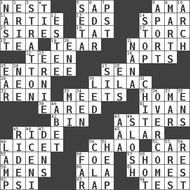 ACROSS 1. A home for chicks 5. Plant excrement 8. Housemaid (var.) 11. Nick name for Arthur 13. Begley and Asner 14. Coast Guard woman 15. Fathers 16. Make lace 17. Torque (variant) 18. Beverage made from leaves 19. Pull apart 21. _ pole 22. Adolescent 24. Tenement units (abbr.) 25. Main course 27. Elected rep. 29. Period of immesurable duration 30. Pale purple color 32. Painter Guido (1575-1642) 33. Confronts 35. Dwelling 39. Having ears or earlike features 41. "Terrible" tsar 42. Storage container 43. Michaelmas daisies 45. Travel on an animal 48. Having or resembling wings 49. It is permitted: Lat. 50. US Secretary of Labor Elaine L. _ 52. 4-wheeled motor vehicle 55. An important port of Yemen 56. Enemy 57. Dinah or Pauly 59. Not women's 60. Chicken ___ king 61. Residences 62. Air pressure measure (abbr.) 63. Reproach for some lapse or misdeed 64. Trial DOWN 1. Political cartoonist Thomas 2. 4th largest of the Great Lakes 3. Ski resort town in Vermont 4. Neckwear 5. Bristle 6. The sixth month of the Jewish calendar 7. Pacific Standard Time (abbr.) 8. To the left, to Queeg 9. Shops 10. Bowlike part 12. First name in cosmetics 14. Constrict 20. Compass dir. 21. Nanny 23. Bert's buddy 25. Hearing organ 26. Born 27. Be seated 28. Raised railways 30. Directed 31. Riviera of "Kiss of the Spider Woman" 33. Medical imaging device (abbr.) 34. Car or cant ending 36. Conquer 37. Third mo. 38. Followers of ems 40. Collude with 43. American Automobile Association (abbr.) 44. Splash clumsily 45. Amusement-park features 46. Ancient Celtic tribe of eastern Britain 47. Cub Scout units 49. Desk light 50. Root beer relative 51. Pile 53. Ancient Greek god of war 54. Respite 56. At a great distance 58. Being at a high temperature