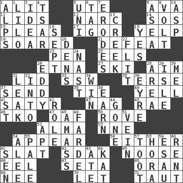 ACROSS 1. Came down and settled, as after flight 5. Shoshoni 8. Actress Gardner 11. Hats (slang) 12. Drug cop 14. Distress signal 15. Entreaties 17. Composer Stravinsky 18. Sharp bark 19. Flew 21. Outscore 23. Fenced enclosure 25. Snakelike fish 26. Inactive volcano in Sicily 27. What Jean-Claude Killy likes to do 28. Direct toward a target or goal 31. Hat (slang) 33. Compass dir. 35. Laconic 37. Post 38. Neckwear 40. Shout 41. Man with strong sexual desires 43. Tired old horse 45. Actress Charlotte 46. Ring climax 47. Clumsy lout 50. Be footloose 52. _ mater 53. Compass dir. 54. Become visible 56. One or the other of two 61. Narrow board 62. Neighbor of Neb. 65. Trap for birds or small mammals 66. Snakelike fish 67. Bristle 68. Northwest Algerian city 69. Born 70. Allow 71. Pulled tight DOWN 1. High mountains 2. _ and Stitch 3. The main thing one is thinking about 4. Russian ruler of old 5. Single; one (prefix) 6. Label 7. Eats (away) 8. Toward the sea 9. Electrical Unit 10. Cleo's killer 13. Small stream 16. Back-to-school mo. 18. Affirmative reply 20. Habitations of wild animals 22. Sudden quick movement 24. Political cartoonist Thomas 26. Whirlpool 28. Type of rug 29. Capri or Wight 30. Cartoonist voice _ Blanc 31. Path through which fluid escapes 32. To the inside or interior of 34. Victory 36. Jane of fiction 37. Fast jet (abbr.) 39. Merit 42. Hero or heavy, e.g. 44. Went 48. Collect or gather 49. Bundle 51. Distinctive style or manner 52. Fitting 54. Toward shelter 55. Diluted with white 57. A blast of a horn 58. Israeli folk dance 59. Son of Isaac 60. Monthly bill 61. Elected rep. 63. Had dinner 64. Krazy ___ of comics