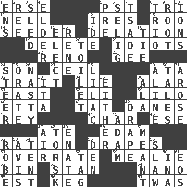 ACROSS 1. Celtic language 5. Pacific Standard Time (abbr.) 8. Three (prefix) 11. 1994 drama film starring Jodie Foster 12. Angers 13. Friend of Pooh 14. Sowing specialist 17. Conveyance 19. Erase 21. Foolish or stupid persons 22. Former U.S. Attorney General Janet 23. Unit of force equal to gravity 24. Male child 27. To provide with a ceiling 29. _ moment's notice (2 wds.) 32. Distinguishing feature 34. Whopper 36. Having or resembling wings 37. Compass direction 38. Connecticut Ivy Leaguer 39. _ and Stitch 40. Singer James 41. Make lace 42. Natives or inhabitants of Denmark 43. Marina Del _, California 44. Burn to charcoal 46. Compass dir. 47. Had dinner 50. Dutch treat 52. Food allowance for one day 55. Window treatments 57. Make much ado about nothing 59. Ear of corn 62. Storage container 63. Comedian Laurel of Laurel & Hardy 64. Billionth: prefix 65. Eastern Standard Time (abbr.) 66. Cask 67. It was, poetically DOWN 1. Followers of ems 2. To separate or throw off 3. Downhill vehicle 4. A person who is older than you are 5. Before (prefix) 6. Major League Baseball Commissioner Bud 7. Sadhe (variant) 8. Musical group of three 9. Carrot, for example 10. Charged atoms 12. Binary compound 15. Choose 16. French philosopher Descartes 18. Standoff 20. Bathroom plumbing fixture 24. Guide 25. Declaim 26. Offensive 28. Pale purple color 29. Place in a line 30. Stories 31. Came up 33. Call ___ day 35. One or the other of two 36. Insect wing 42. Window treatment 45. First of billions? 47. Wind 48. Cod relative 49. Related on the mother's side 51. Intended 52. Loose flowing garment 53. Deliberation 54. Portable shelter 55. Lair 56. Cole _ (cabbage dish) 58. Label 60. _ tizzy (2 wds.) 61. Greek goddess of the dawn